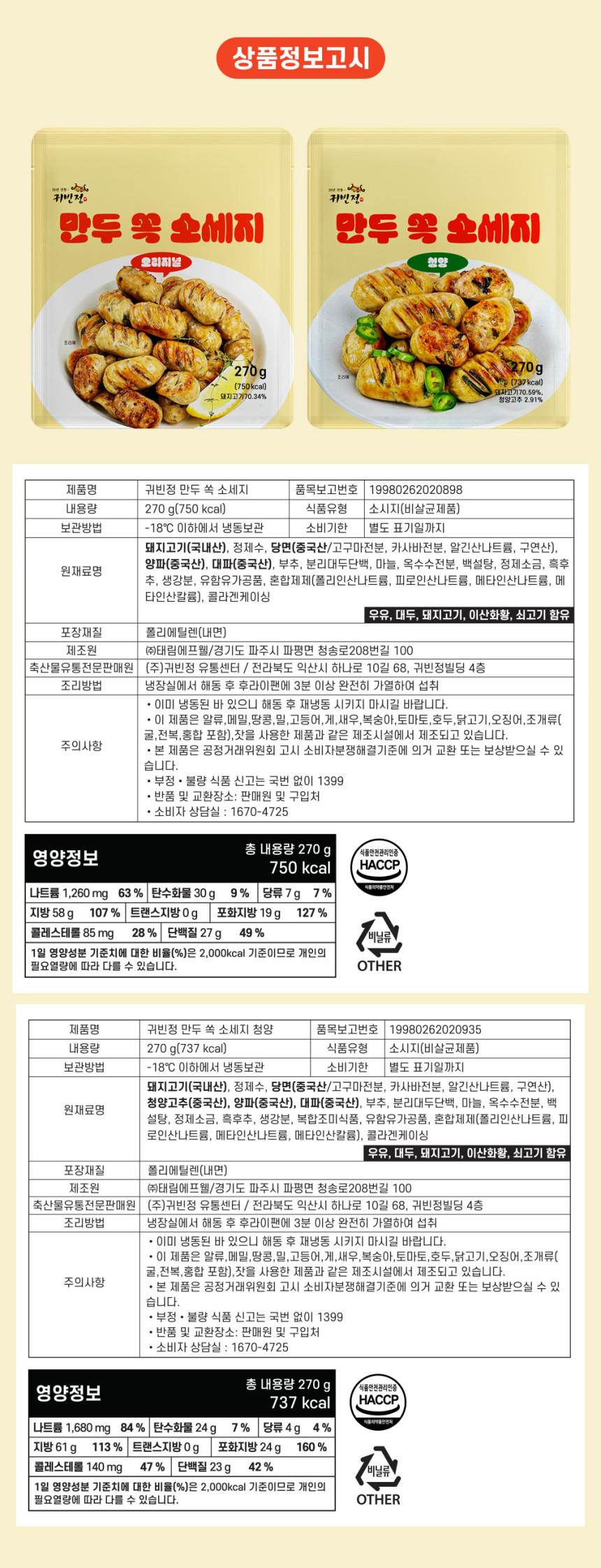 [귀빈정] 프리미엄 만두 쏙 소세지 270g (기본/청양 중 택일)