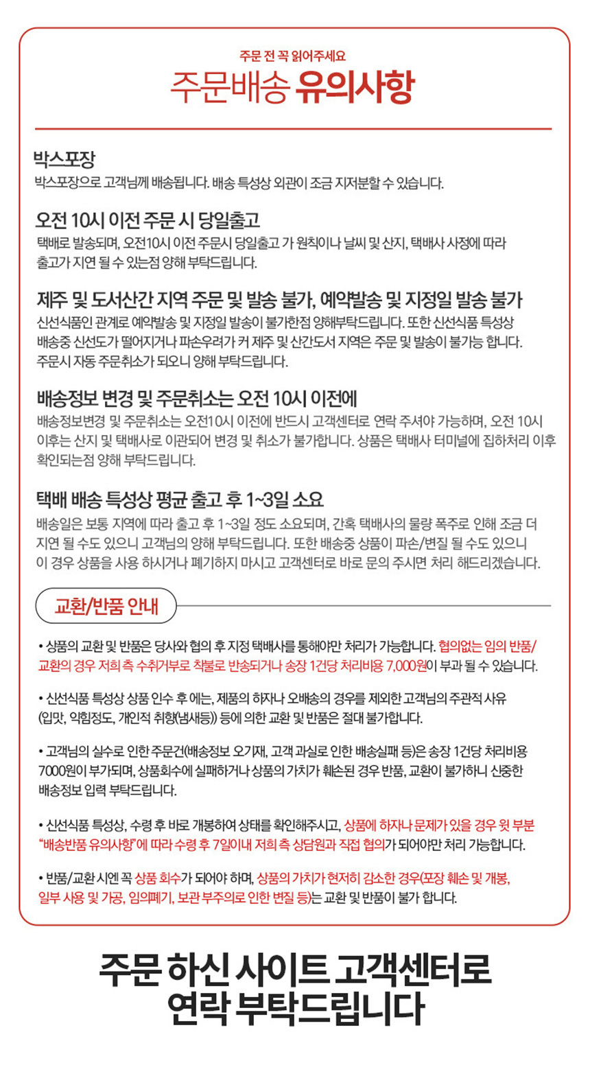 - 상품 수령 후 7일 이내에 신청하실 수 있습니다. 단, 제품이 표시·광고 내용과 다르거나, 계약과 다르게 이행된 경우는 제품 수령일부터 3개월 이내, 그 사실을 안 날 또는 알 수 있었던 날부터 30일 이내에 교환/반품이 가능합니다.