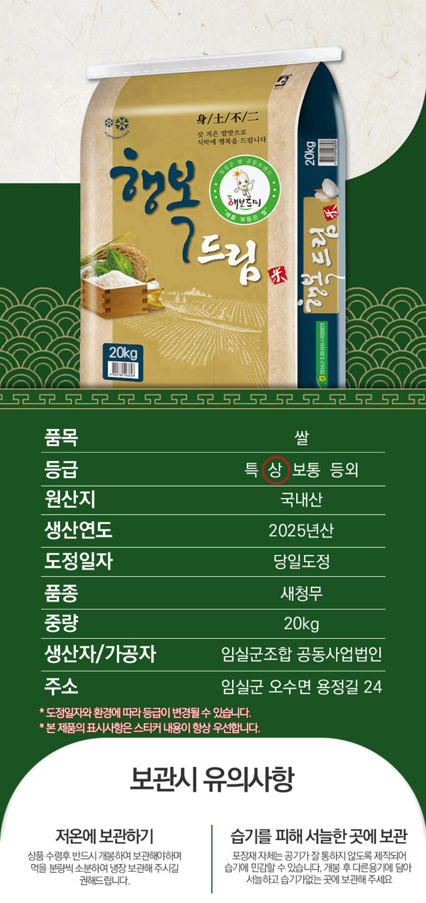 2025년 임실농협행복드림 20kg [당일도정] 쌀