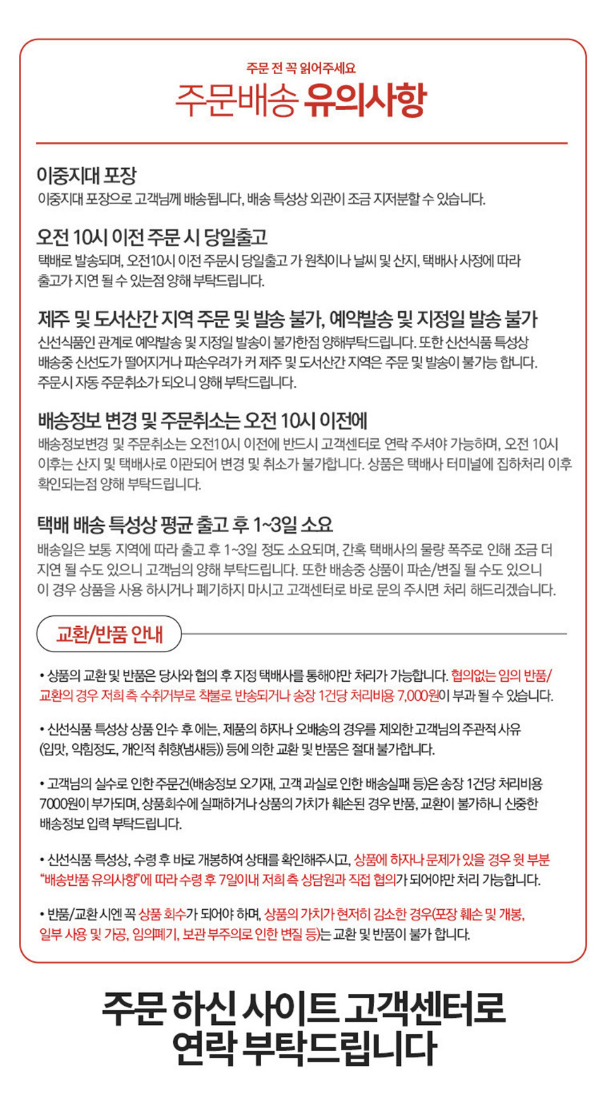 - 상품 수령 후 7일 이내에 신청하실 수 있습니다. 단, 제품이 표시·광고 내용과 다르거나, 계약과 다르게 이행된 경우는 제품 수령일부터 3개월 이내, 그 사실을 안 날 또는 알 수 있었던 날부터 30일 이내에 교환/반품이 가능합니다.