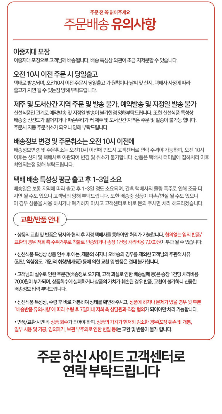 - 상품 수령 후 7일 이내에 신청하실 수 있습니다. 단, 제품이 표시·광고 내용과 다르거나, 계약과 다르게 이행된 경우는 제품 수령일부터 3개월 이내, 그 사실을 안 날 또는 알 수 있었던 날부터 30일 이내에 교환/반품이 가능합니다.