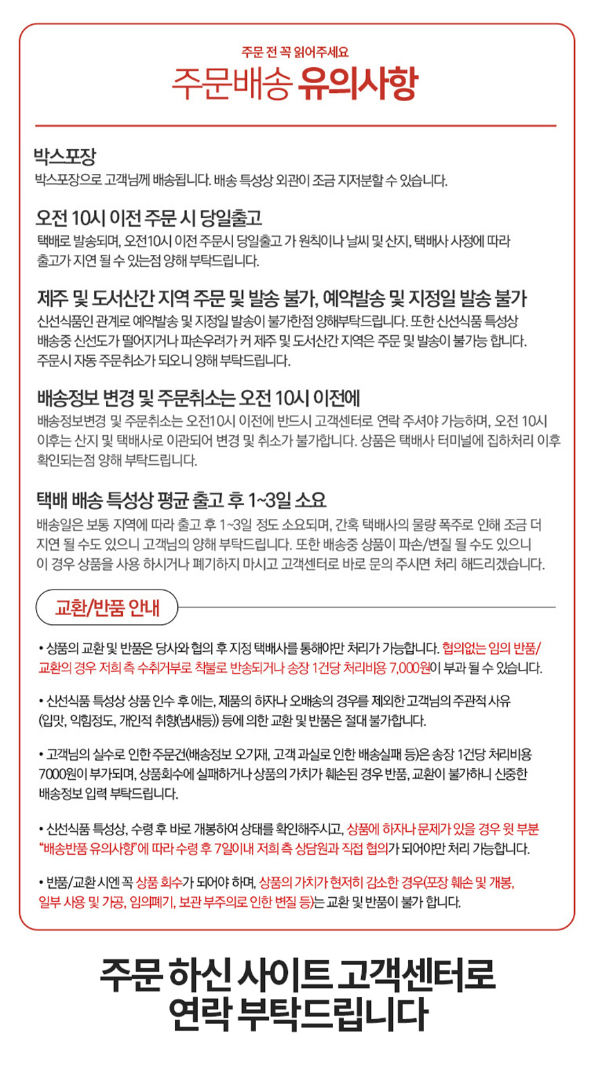- 상품 수령 후 7일 이내에 신청하실 수 있습니다. 단, 제품이 표시·광고 내용과 다르거나, 계약과 다르게 이행된 경우는 제품 수령일부터 3개월 이내, 그 사실을 안 날 또는 알 수 있었던 날부터 30일 이내에 교환/반품이 가능합니다.