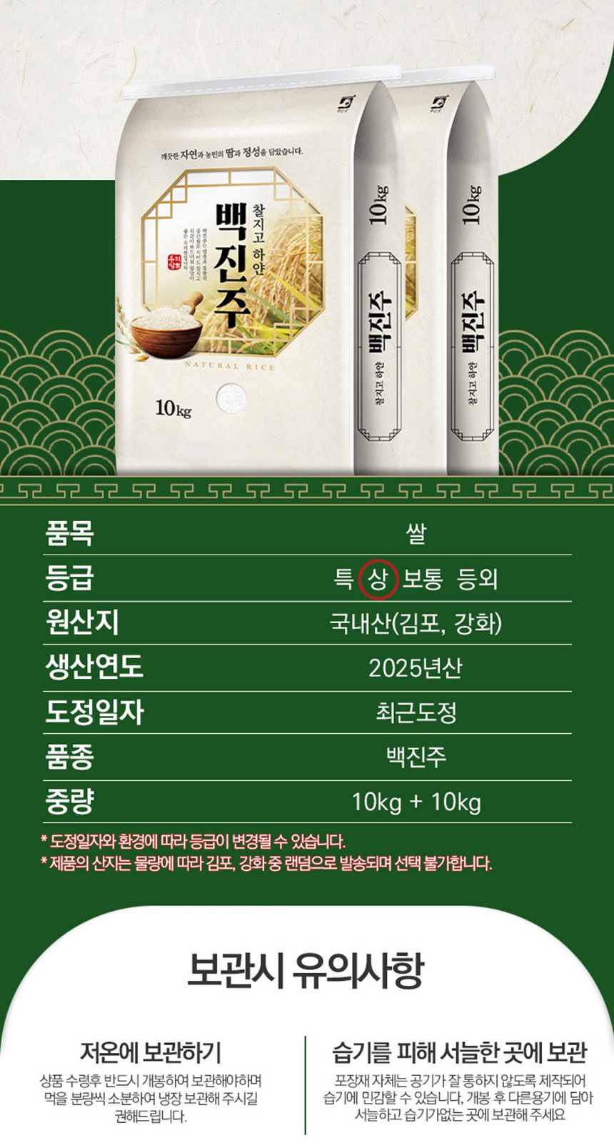 2025년 찰지고하얀백진주 20kg 상등급 쌀