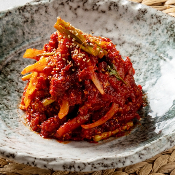 명태채(러시아산)57.5%,물엿(중국산),설탕,2배식초[사과농축액{사과100%(중국산)}],정제소금,파프리카분말,고춧가루,간마늘,생강가루,L-글루탐산나트륨(향미증진제),참기름,참깨,검정깨(흑임자),D-솔비톨(김미료),청양고춧가루