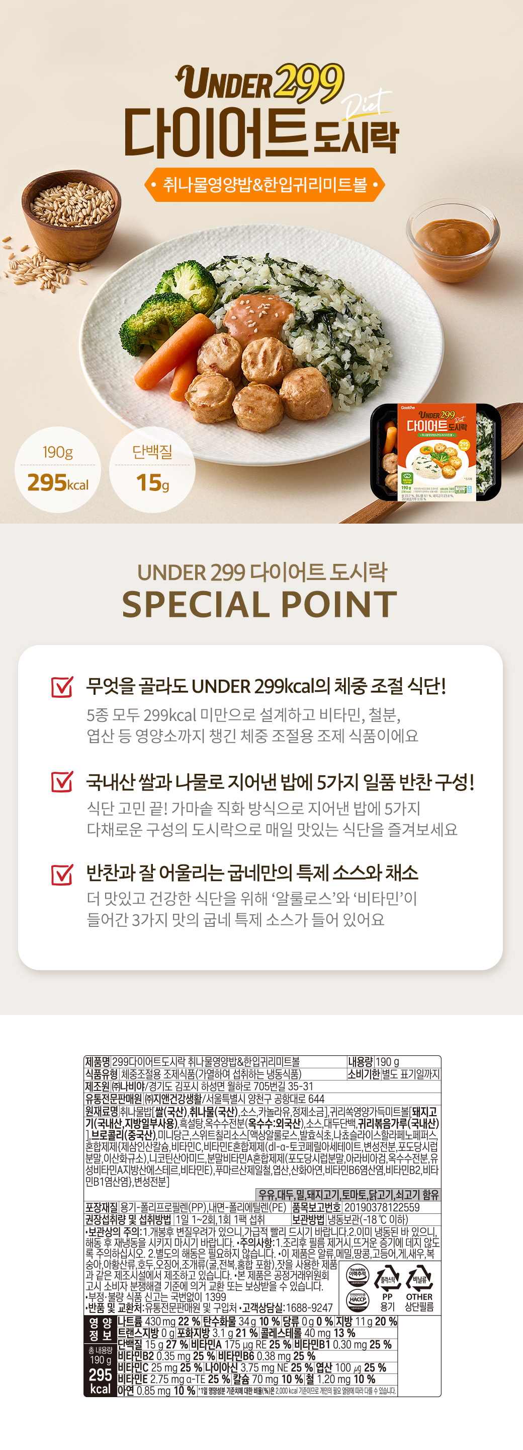 [만원의행복][굽네] 299 다이어트 도시락 취나물영양밥&한입귀리미트볼 3팩+닭가슴살 큐브 갈비맛 1팩