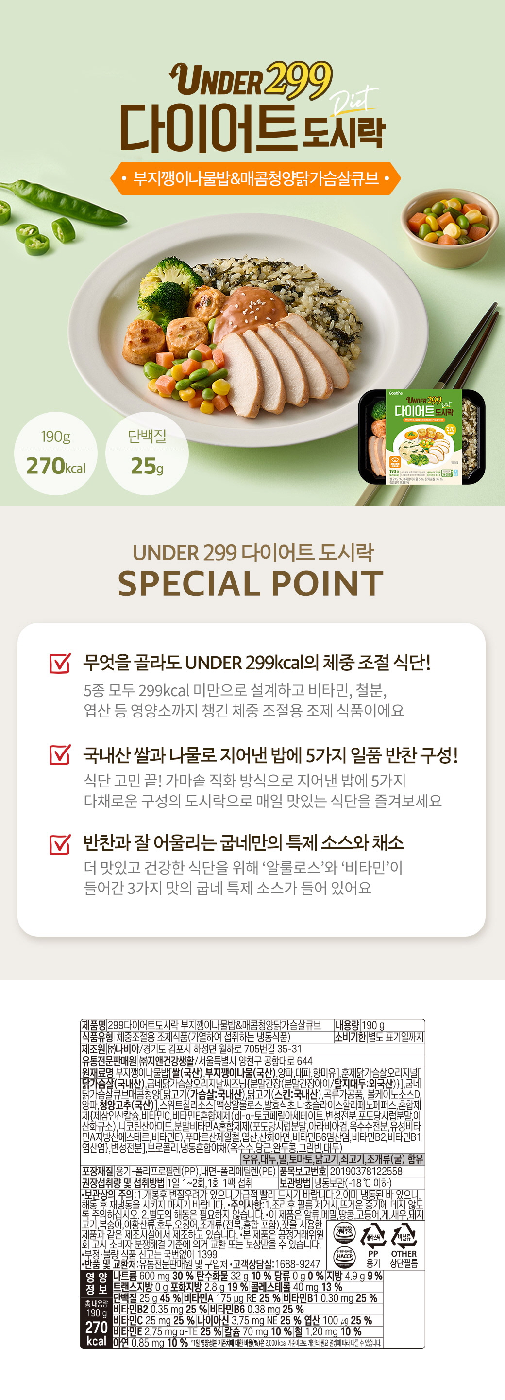 [만원의행복][굽네] 299 다이어트 도시락 부지깽이나물밥&매콤청양닭가슴살큐브 2팩 + 시래기표고버섯솥밥&탱글갈릭비엔나 1팩