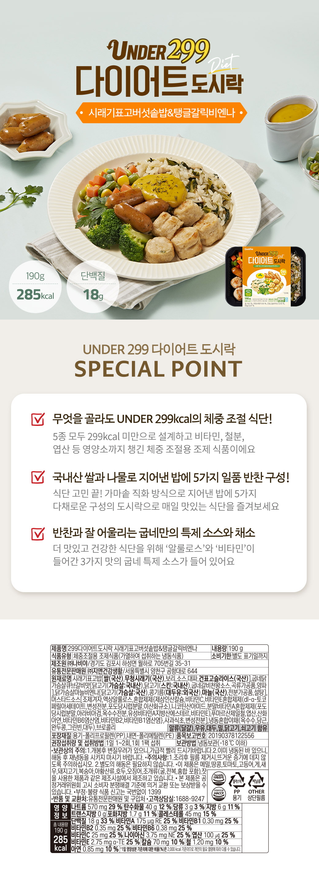 [만원의행복][굽네] 299 다이어트 도시락 시래기표고버섯솥밥&탱글갈릭비엔나 2팩 + 취나물영양밥&한입귀리미트볼 1팩