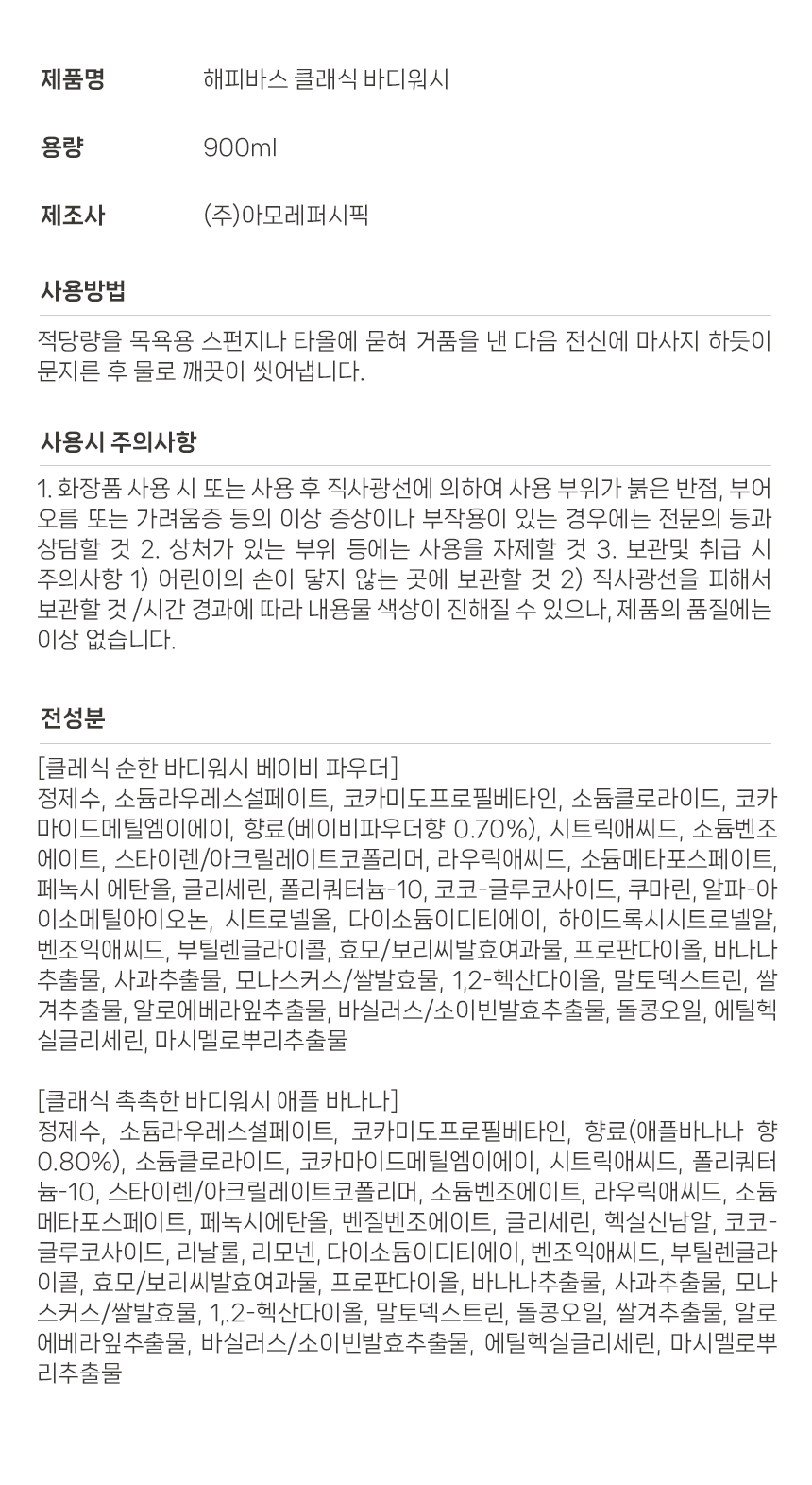 해피바스  클래식 순한 바디워시 900g 베이비파우더향