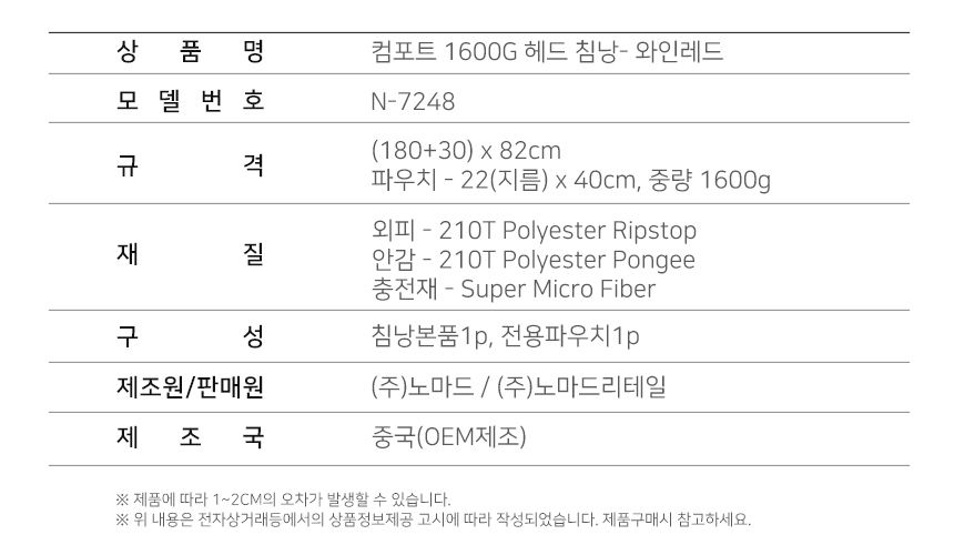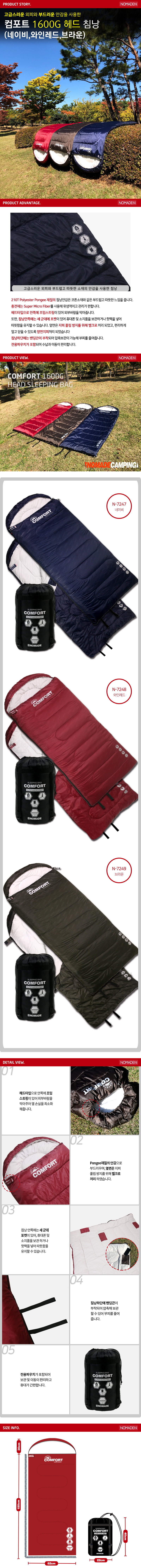 노마드 컴포트 1600G 헤드침낭 (WineRed 와인레드) 차박 캠핑 용품 N-7248
