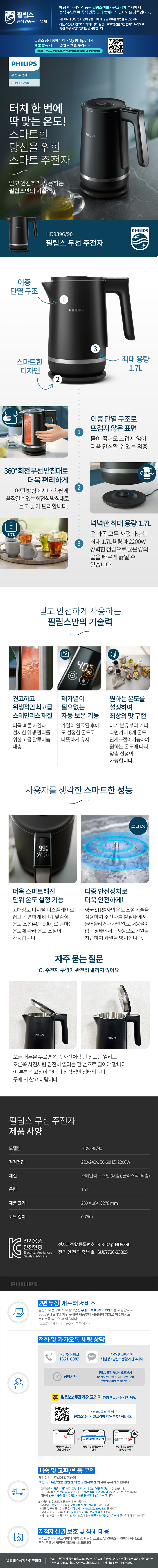 필립스 HD9396/90 스마트 무선주전자 2200W 1.7L 이중단열 6단계 온도설정