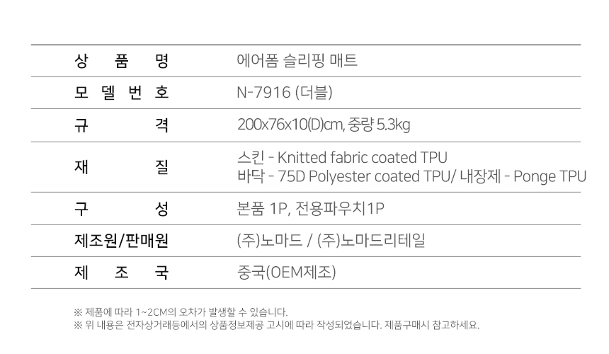 노마드 에어폼 슬리핑 매트(더블) 자동 충전 차박 휴대용 캠핑 용품 N-7916