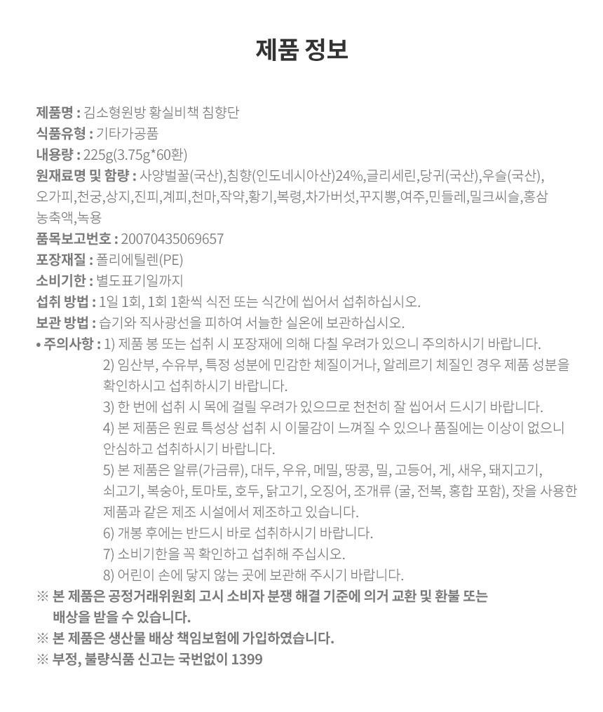 | 포장단위별 용량(중량), 수량 | 3.75g x 60환 (225g) |