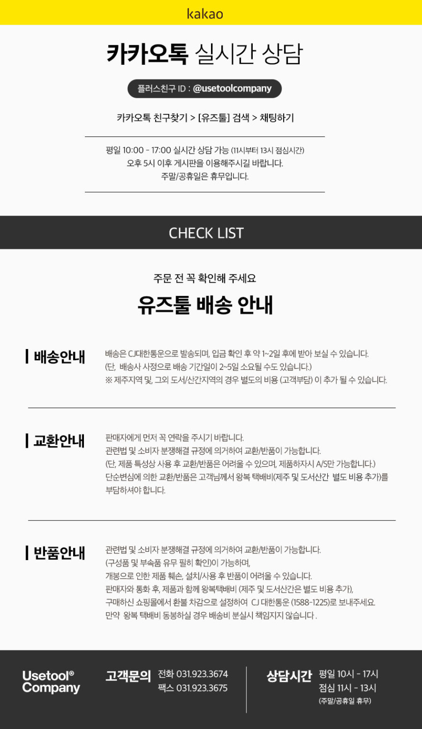 - 상품 수령 후 7일 이내에 신청하실 수 있습니다. 단, 제품이 표시·광고 내용과 다르거나, 계약과 다르게 이행된 경우는 제품 수령일부터 3개월 이내, 그 사실을 안 날 또는 알 수 있었던 날부터 30일 이내에 교환/반품이 가능합니다.