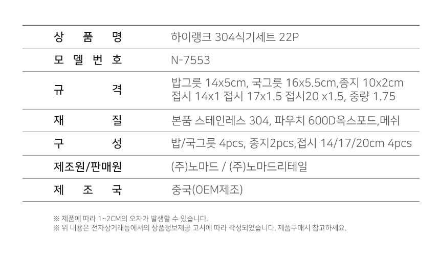 노마드 하이랭크 304 식기22P 세트 코펠 스텐 휴대용 캠핑 용품 N-7553