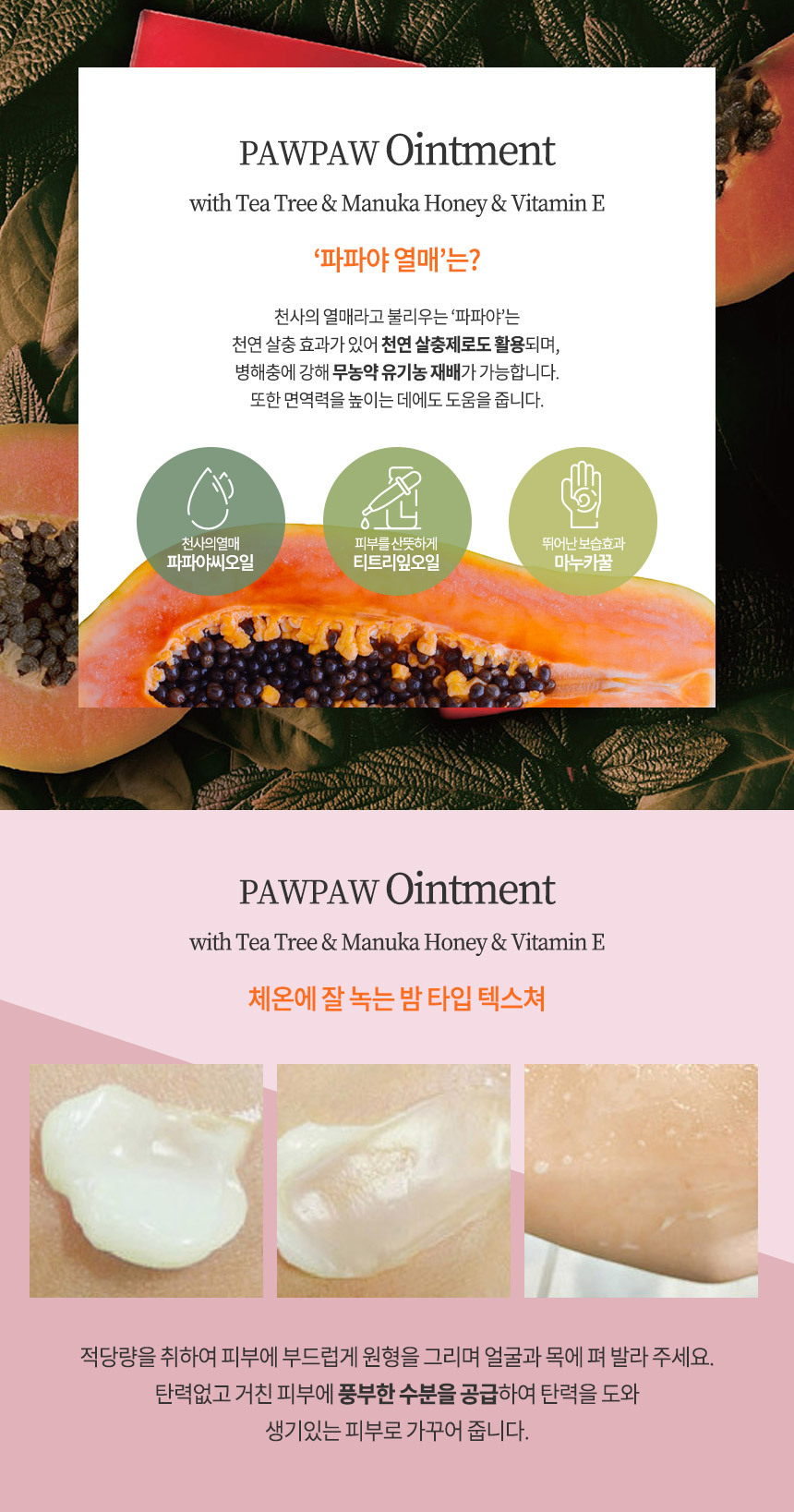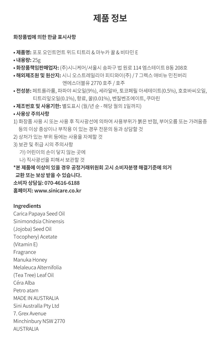 주요성분 페트롤라룸, 파파야 씨오일(9%), 세라알바, 토코페릴 아세테이트(0.5%), 호호바씨오일, 티트리잎오일(0.1%), 향료, 꿀(0.01%), 벤질벤조에이트, 쿠마린