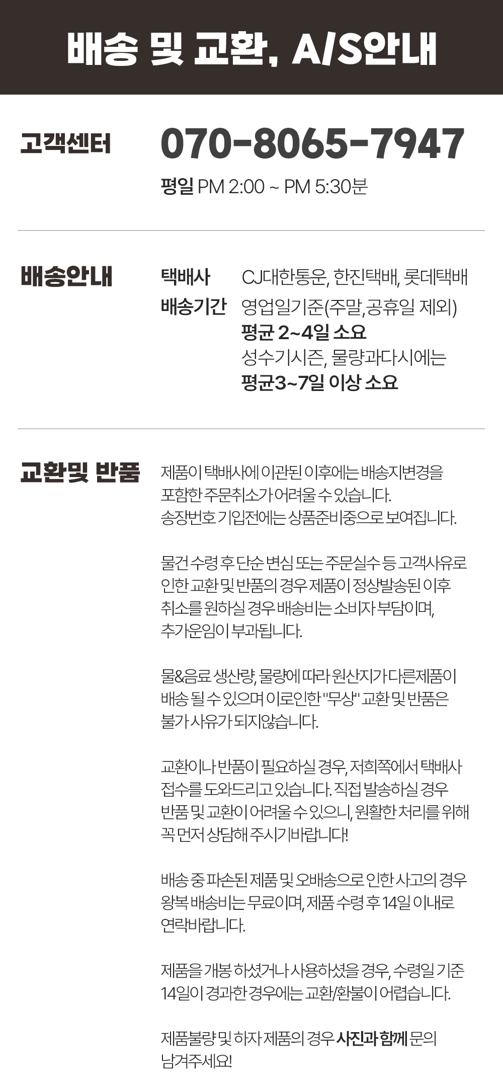 - 상품 수령 후 7일 이내에 신청하실 수 있습니다. 단, 제품이 표시·광고 내용과 다르거나, 계약과 다르게 이행된 경우는 제품 수령일부터 3개월 이내, 그 사실을 안 날 또는 알 수 있었던 날부터 30일 이내에 교환/반품이 가능합니다.