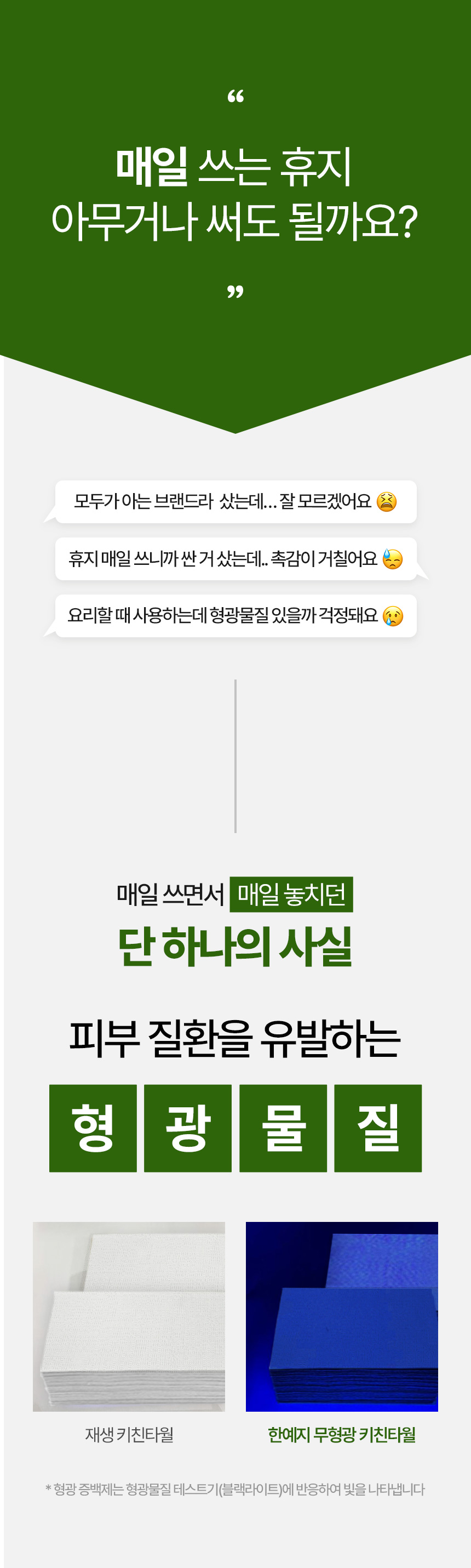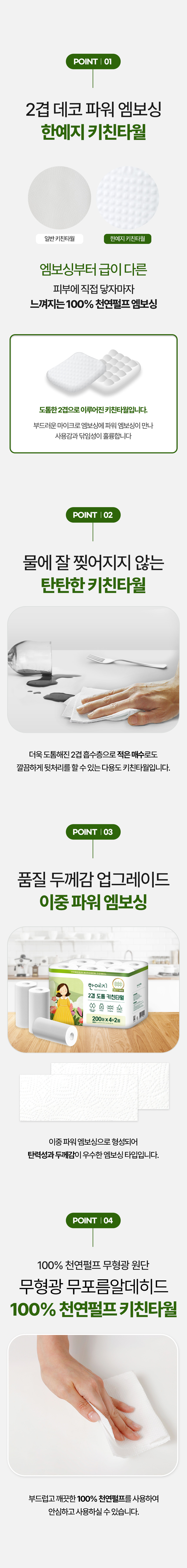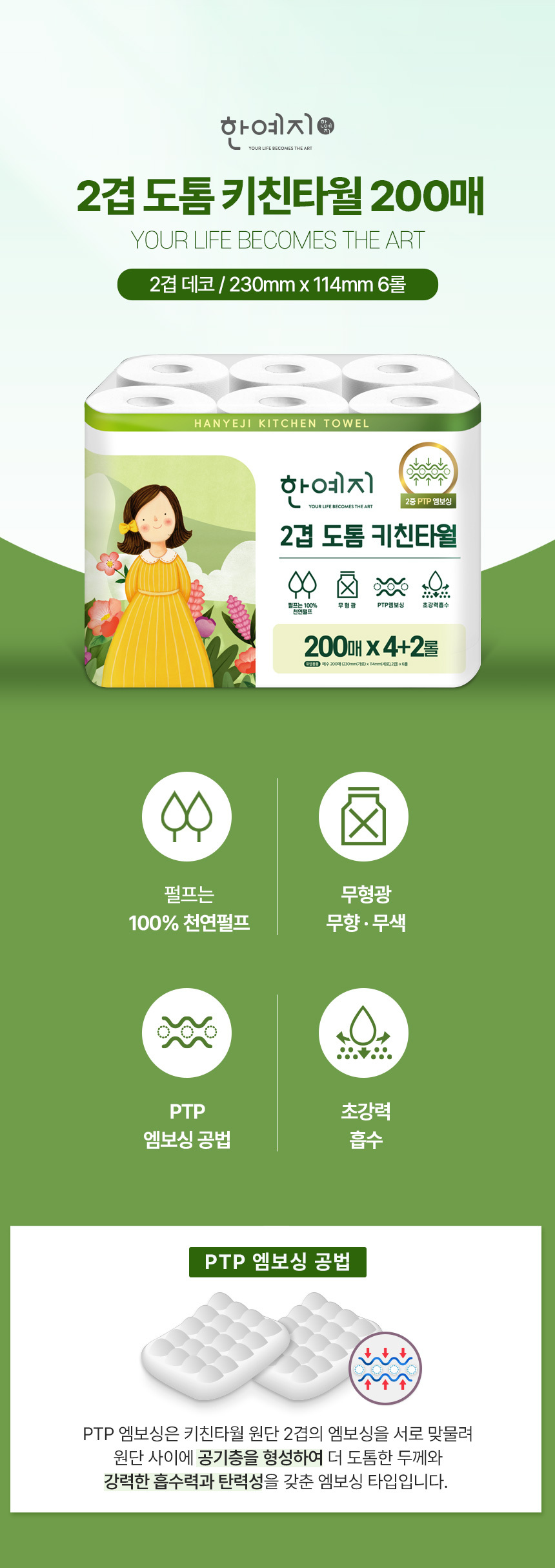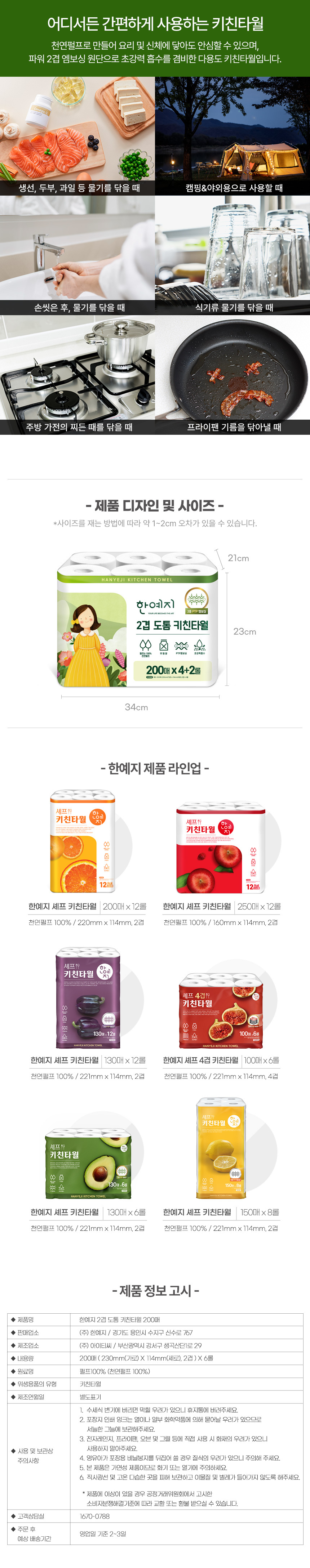한예지 도톰 천연펄프 키친타올 200매 6롤 × 3팩