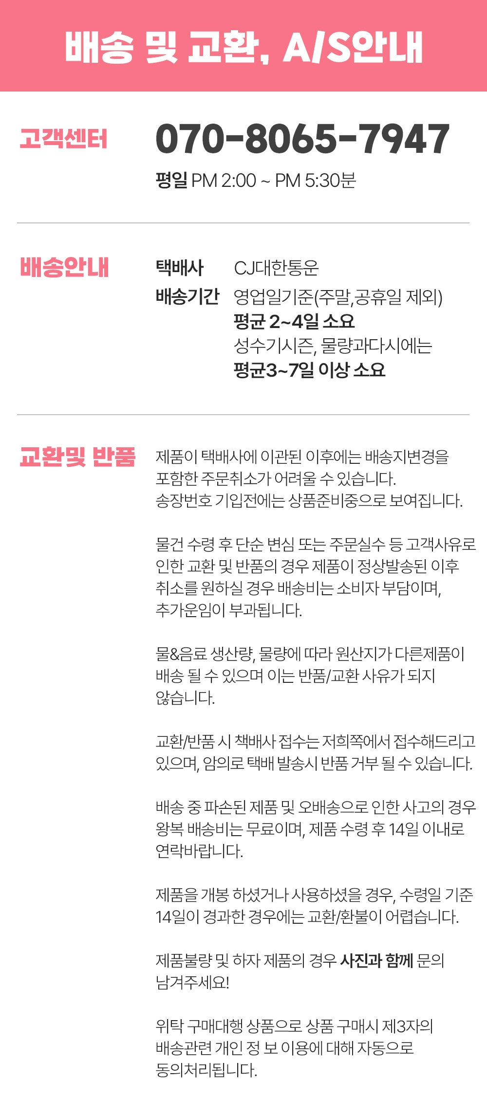 - 상품 수령 후 7일 이내에 신청하실 수 있습니다. 단, 제품이 표시·광고 내용과 다르거나, 계약과 다르게 이행된 경우는 제품 수령일부터 3개월 이내, 그 사실을 안 날 또는 알 수 있었던 날부터 30일 이내에 교환/반품이 가능합니다.