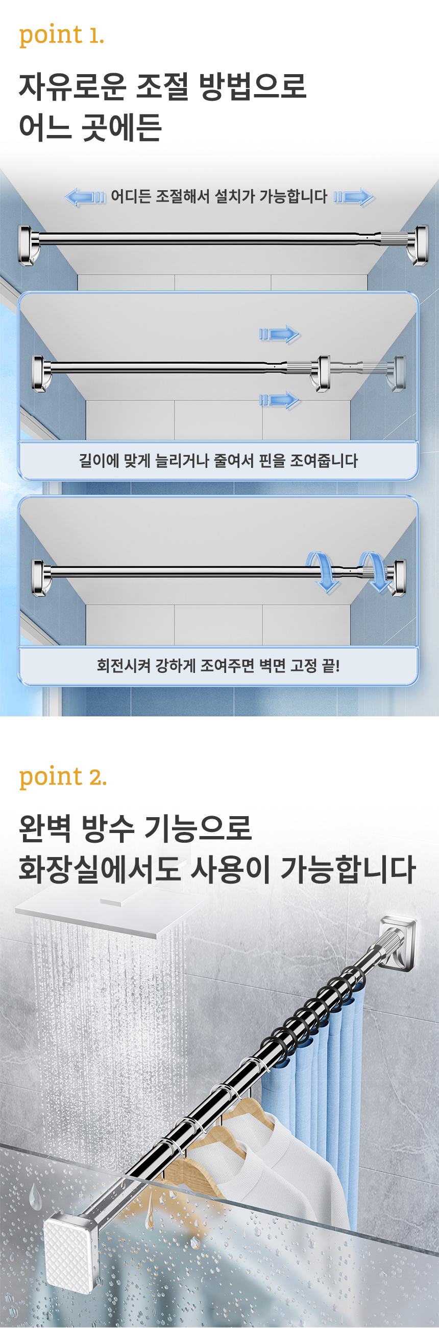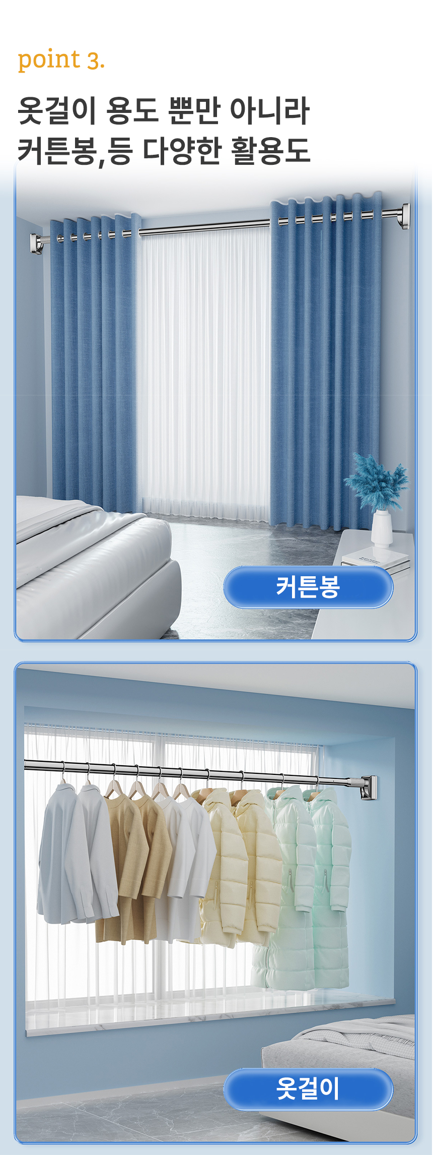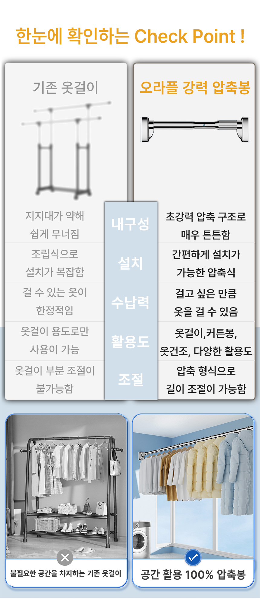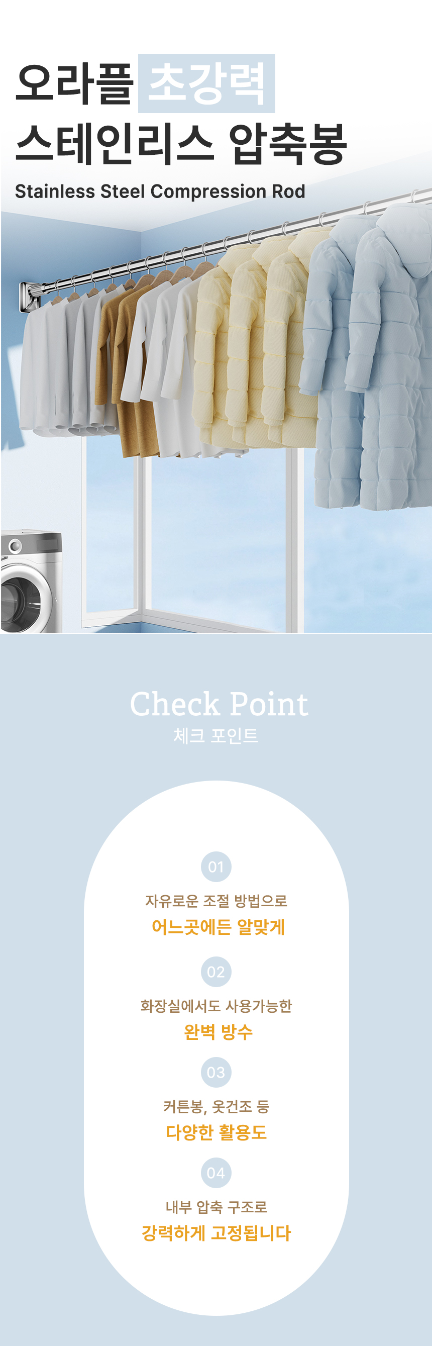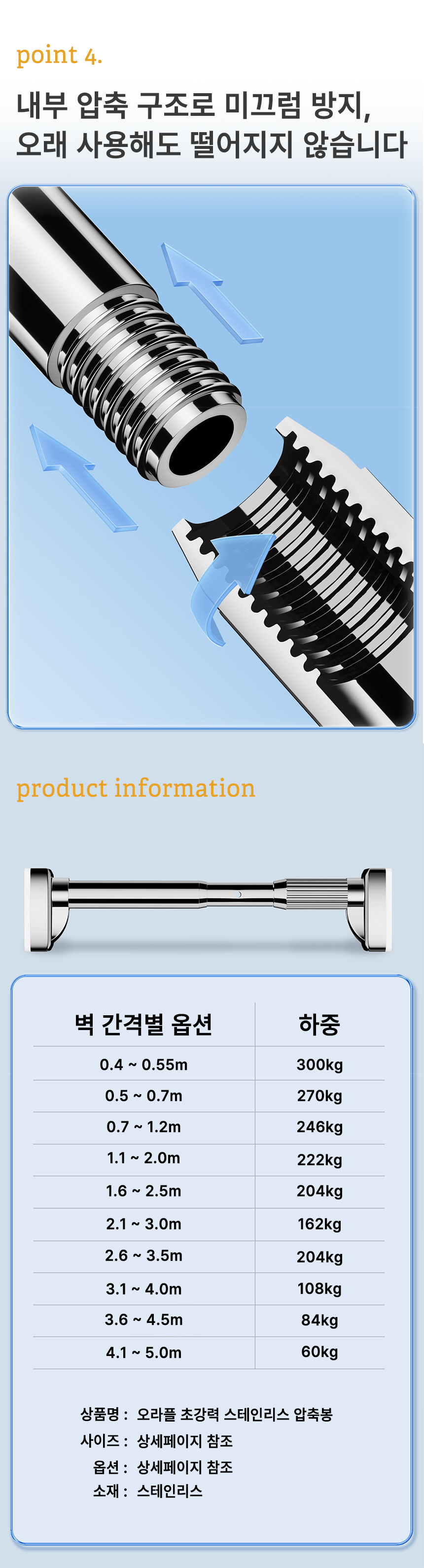 [오라플] 스텐 압축봉 커튼봉 길이조절 강력 튼튼한 다용도 고정봉(사이즈 3.1~4.0m)
