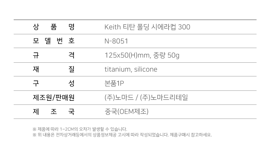 노마드 Keith 티탄 폴딩 시에라컵300 휴대용 캠핑 용품 N-8051