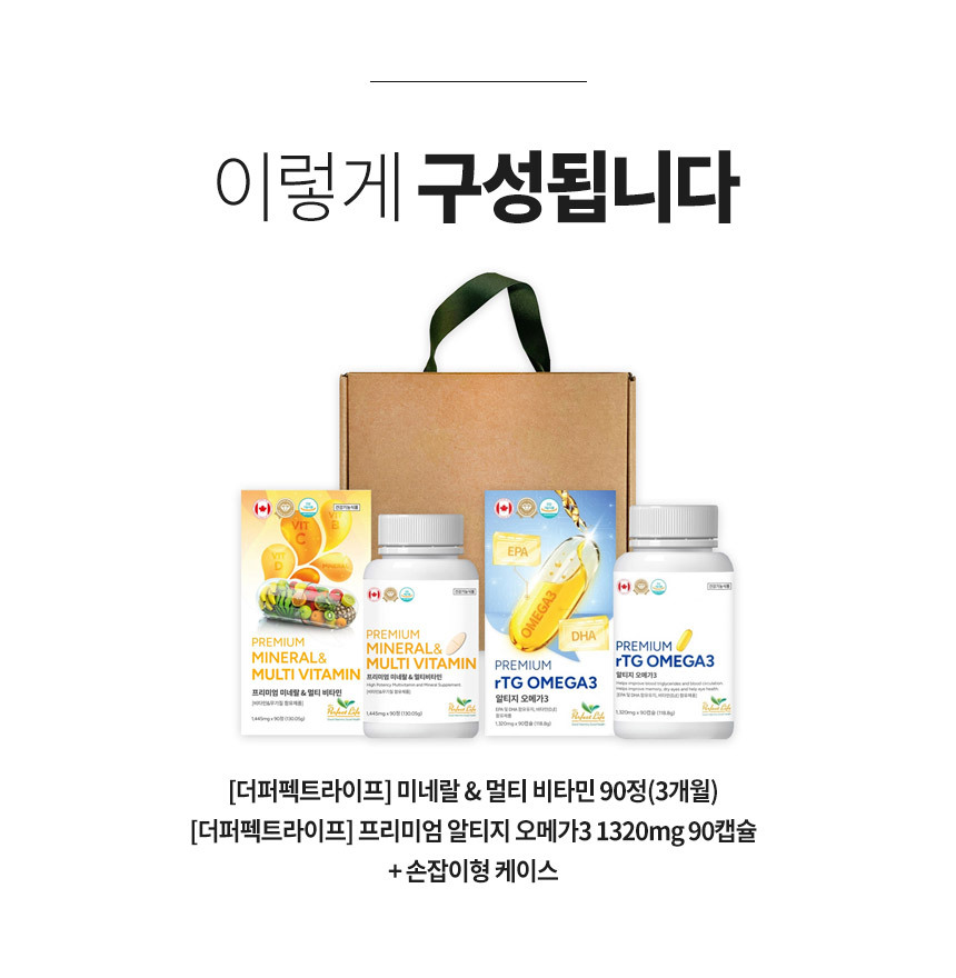 | 포장단위별 용량(중량), 수량 | [프리미엄 선물세트] 미네랄&멀티비타민(90정) + 알티지오메가3(90캡슐) |