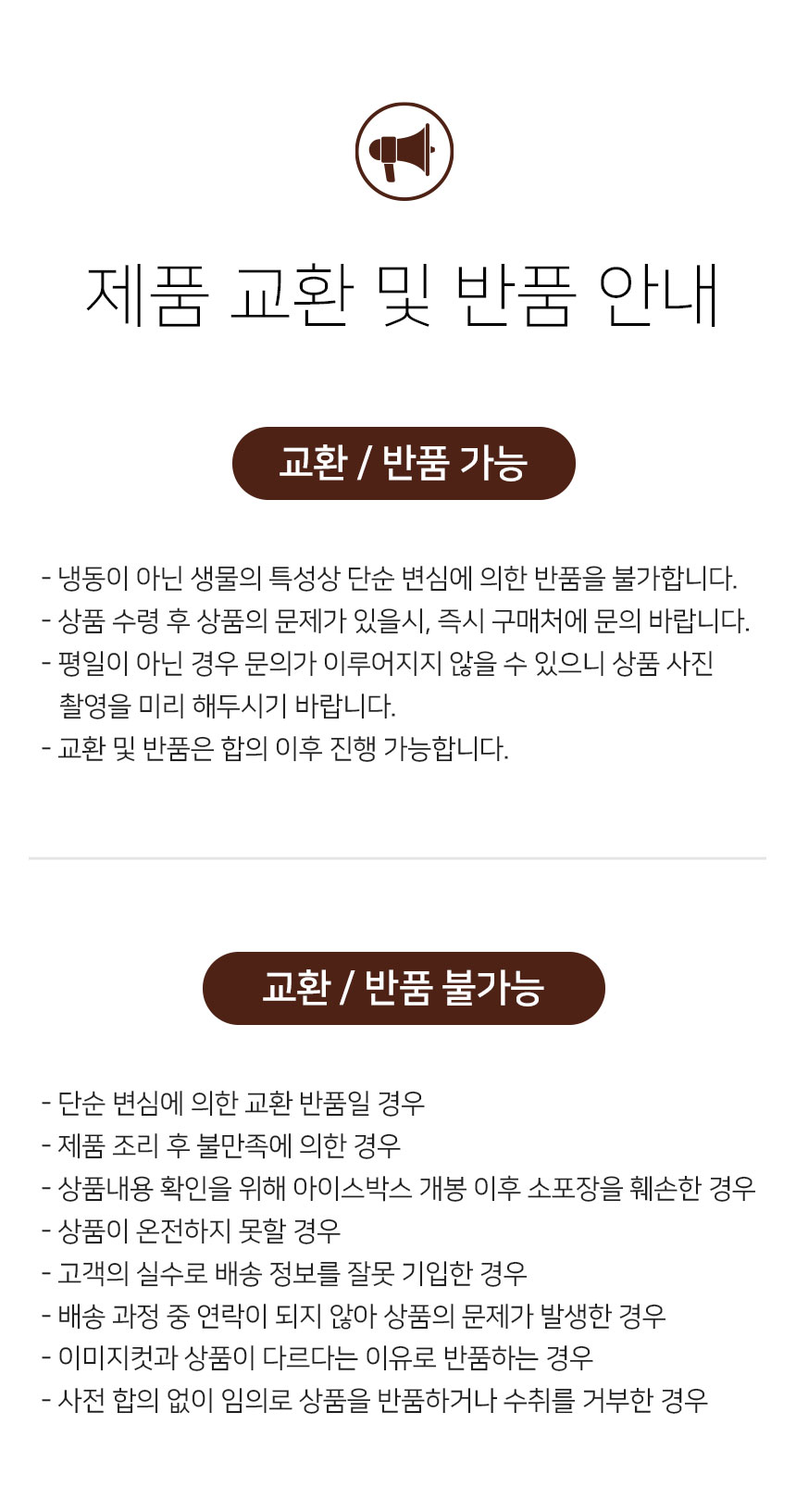 - 상품 수령 후 7일 이내에 신청하실 수 있습니다. 단, 제품이 표시·광고 내용과 다르거나, 계약과 다르게 이행된 경우는 제품 수령일부터 3개월 이내, 그 사실을 안 날 또는 알 수 있었던 날부터 30일 이내에 교환/반품이 가능합니다.