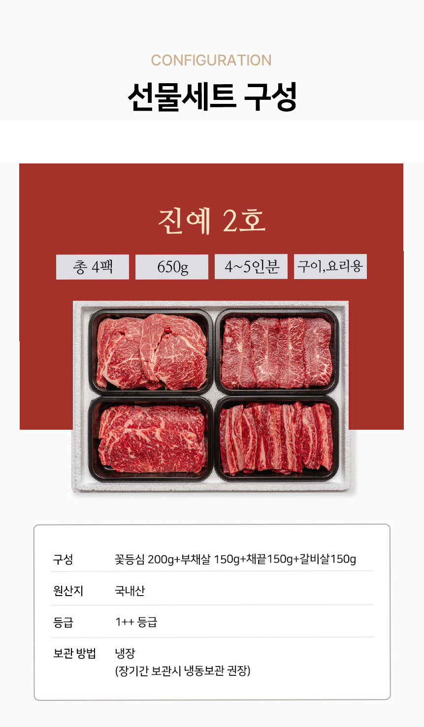 [진우담] 1++한우 구이용 모듬 진예 2호 650g(꽃등심200g+부채살150g+채끝150g+갈비살150g)