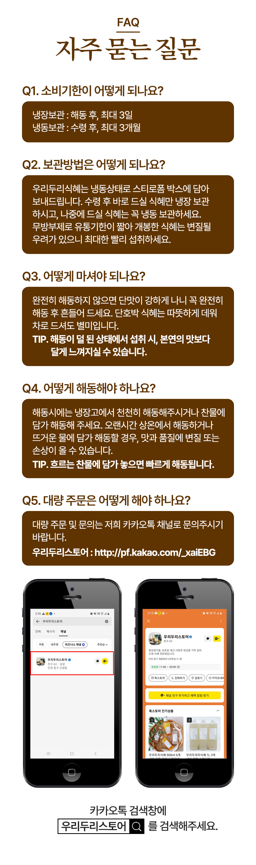 오랜 시간 실온 해동하시거나 뜨거운 물에 담가 해동하시면 맛과 품질에 변질 또는 손상이 일어날 수 있습니다.