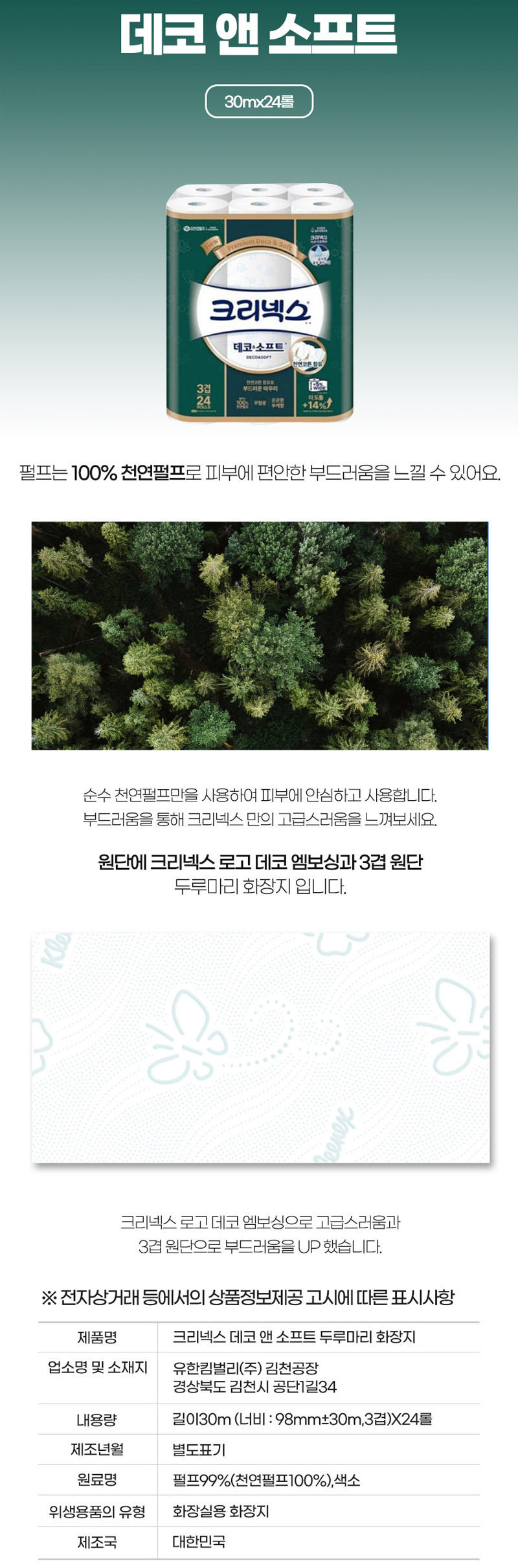 데코앤 소프트 와이드3겹 롤 화장지 대용량 휴지 30m 24롤