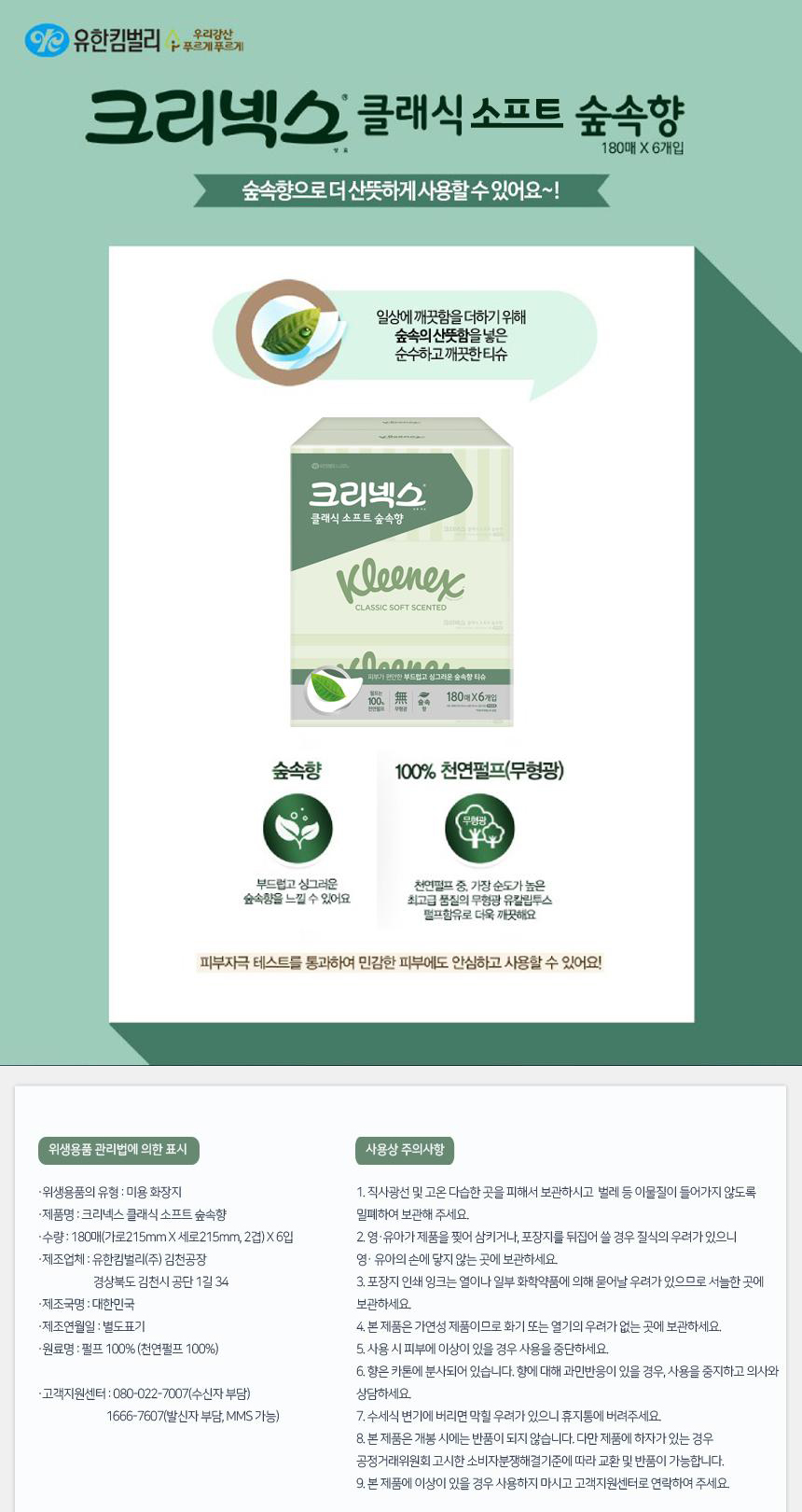 [크리넥스] 클래식 소프트 숲속향 미용티슈 각티슈 천연펄프 화장지 180매 6입