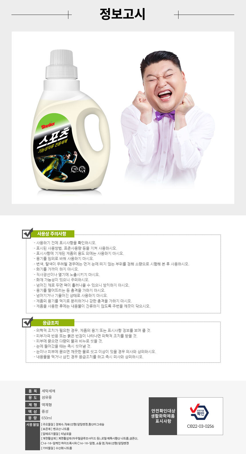 강호동의 쉬슬러 액상 세제 스포츠의류전용 650ml 2개+세제리필 500ml 8개