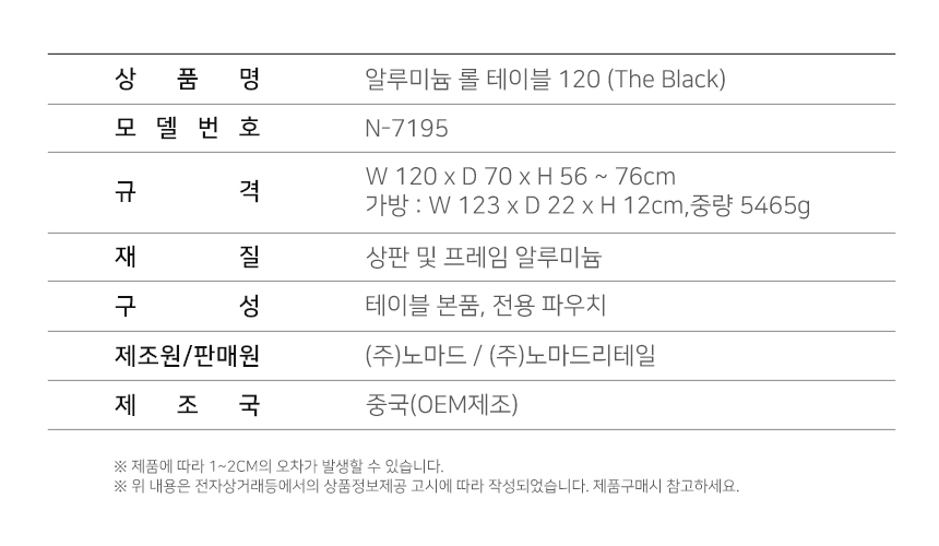 노마드 알루미늄 롤 테이블 120(THEBLACK) 접이식 휴대용 캠핑 용품 N-7195