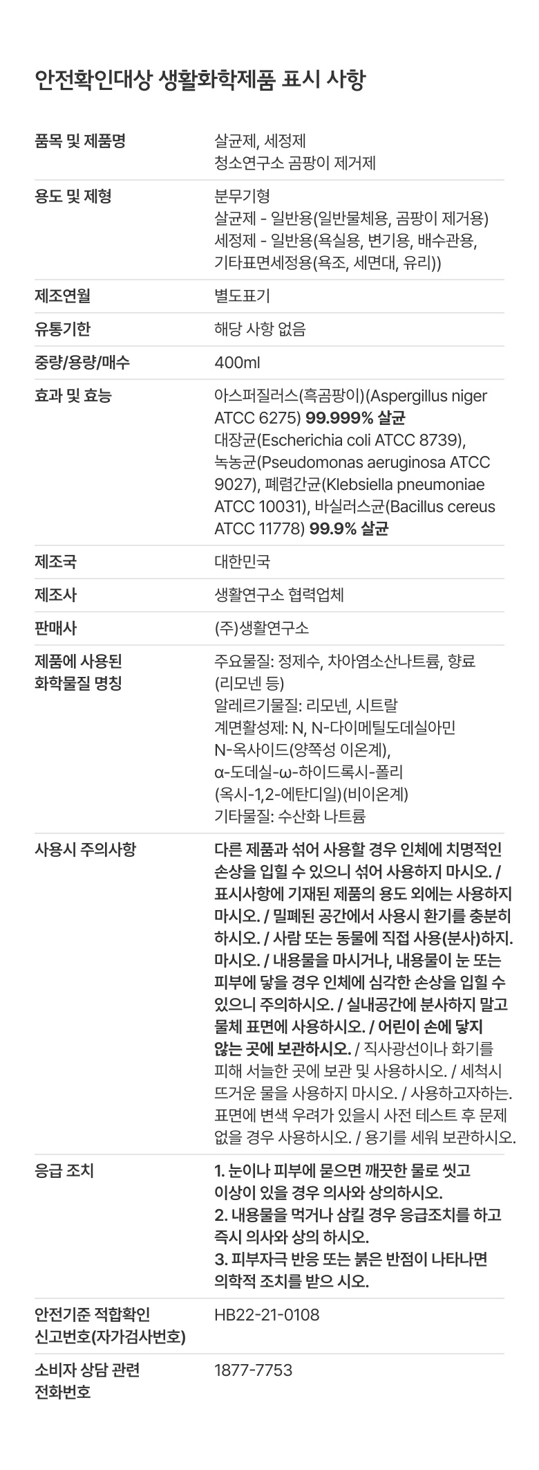 [청소연구소] 국내생산 곰팡이 제거제 (400ml*2개)