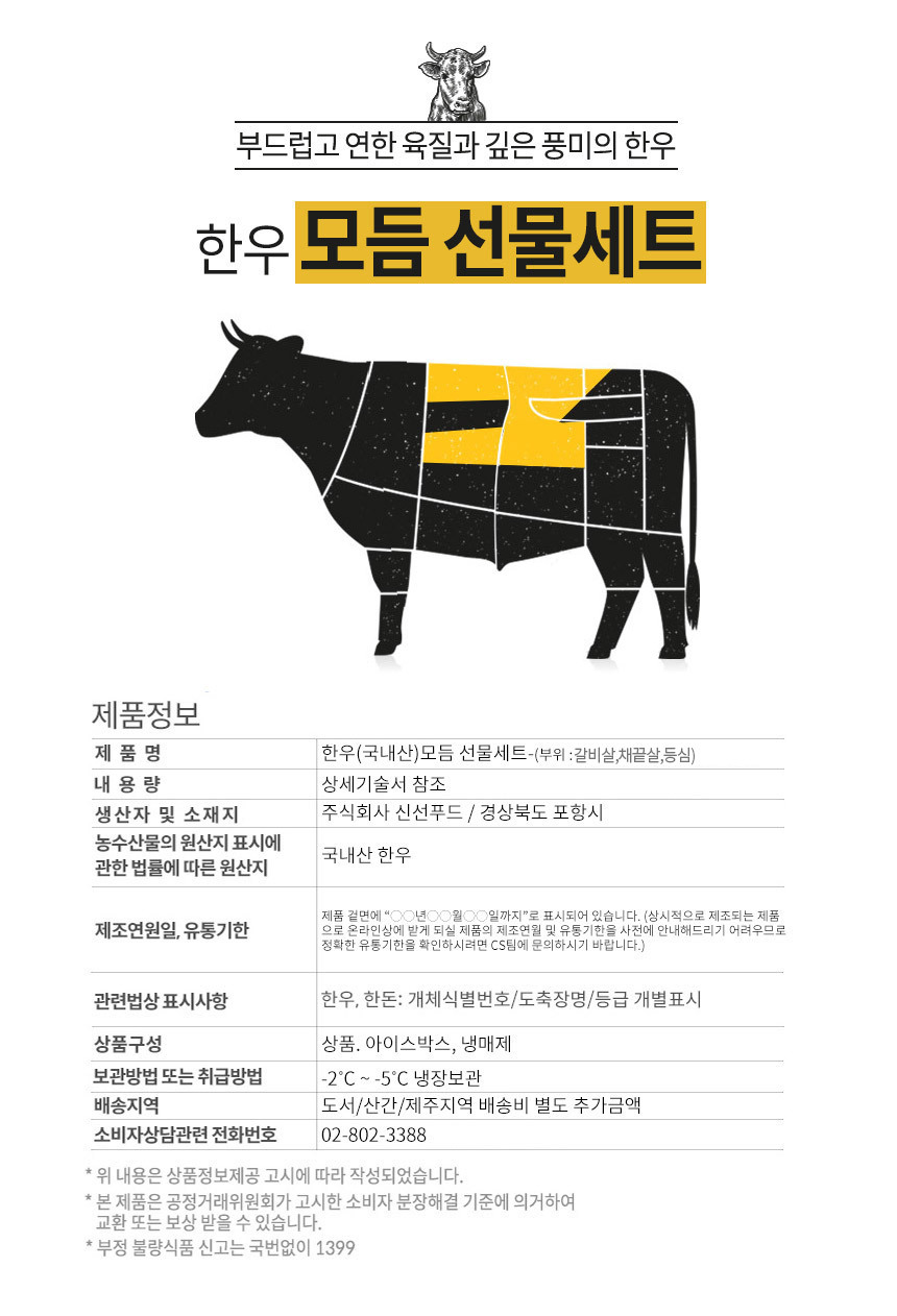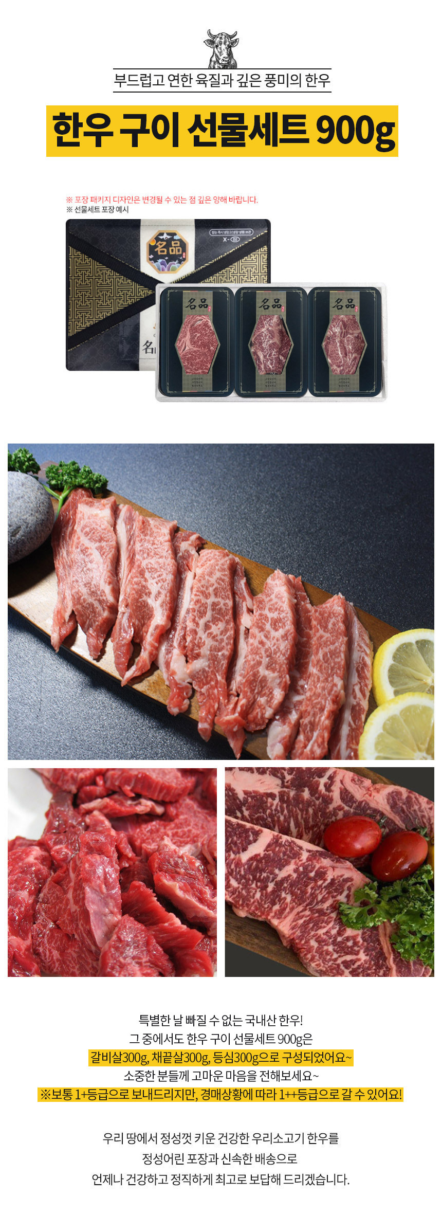 상품구성 국내산 1+(1++) 한우 구이 선물세트 900g (갈비살300g,채끝살300g,등심300g)