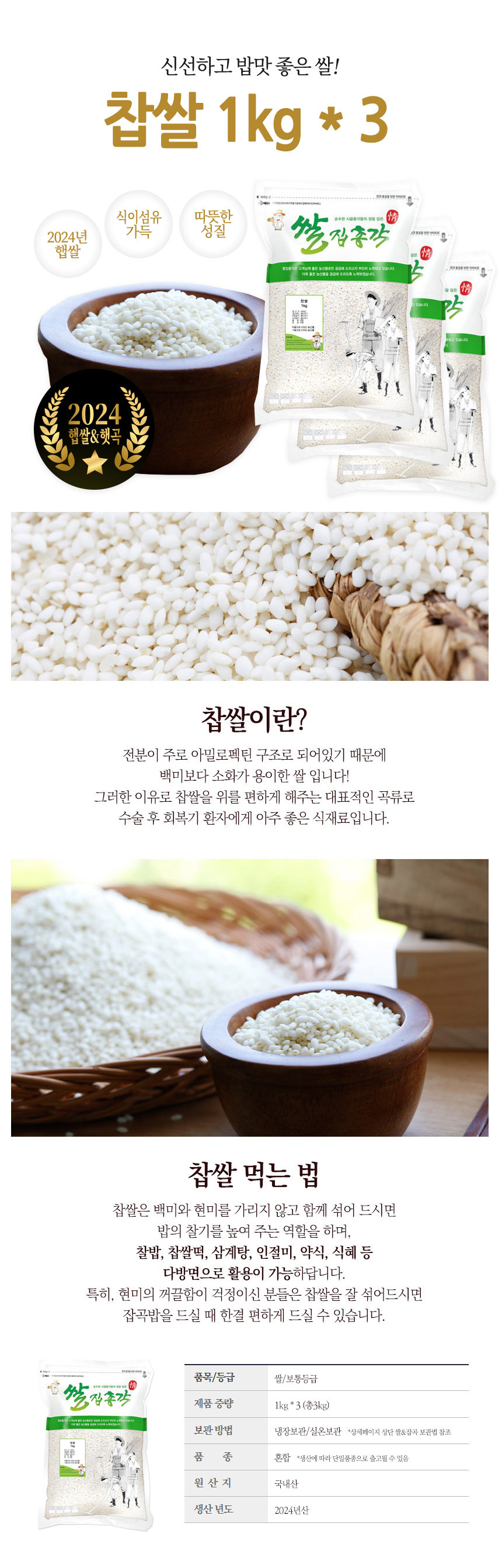 [2024년햅쌀] 국내산 찹쌀 1kg x 3 (총3kg)