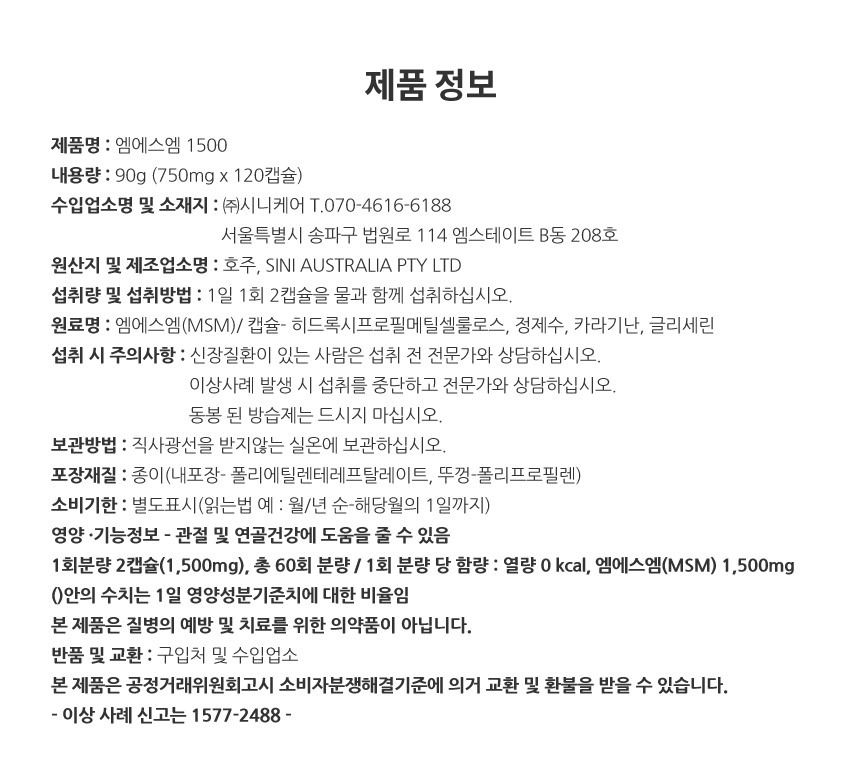 [시니케어] 엠에스엠1500 (MSM) 750mg 120캡슐