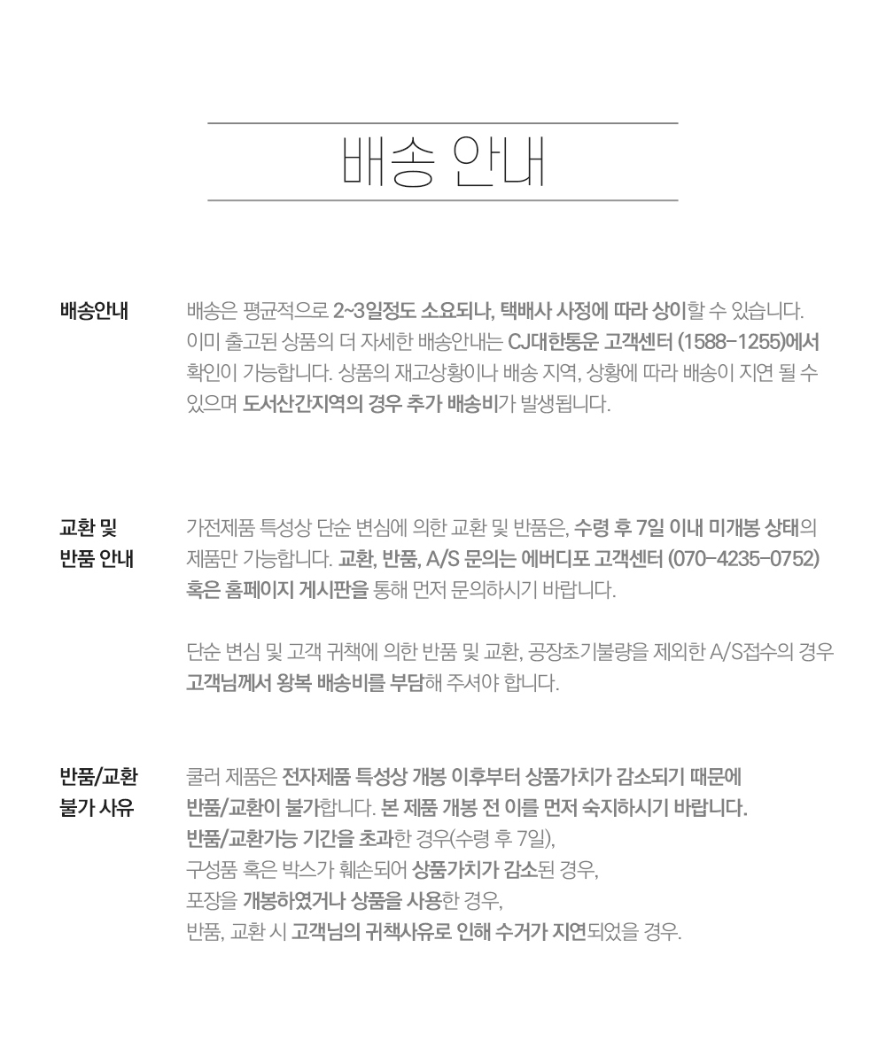 - 상품 수령 후 7일 이내에 신청하실 수 있습니다. 단, 제품이 표시·광고 내용과 다르거나, 계약과 다르게 이행된 경우는 제품 수령일부터 3개월 이내, 그 사실을 안 날 또는 알 수 있었던 날부터 30일 이내에 교환/반품이 가능합니다.