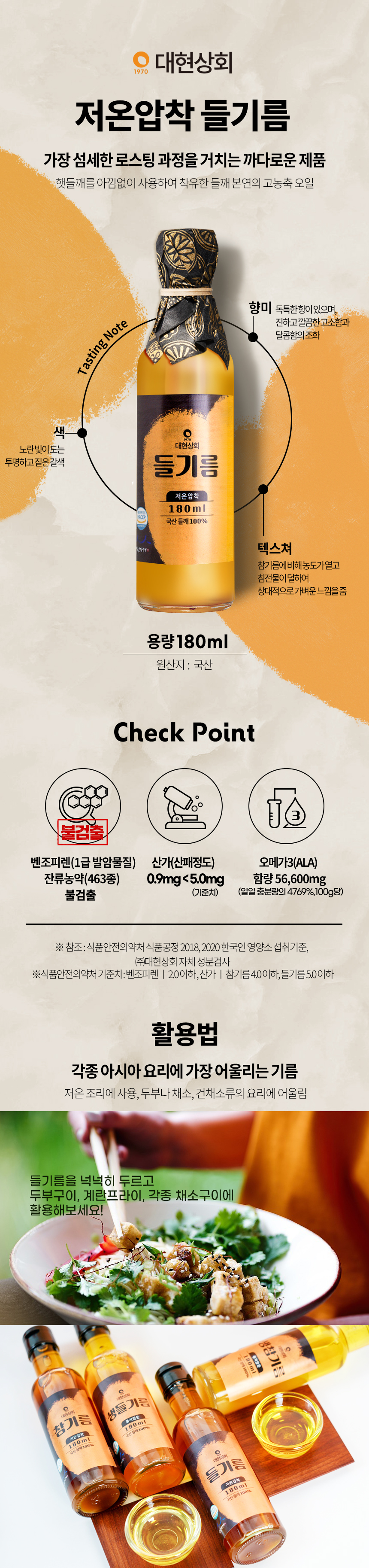 55년전통 대현상회 저온압착 국산 참기름 들기름 생들기름 180ml 모음 / HACCP 인증 백년가게