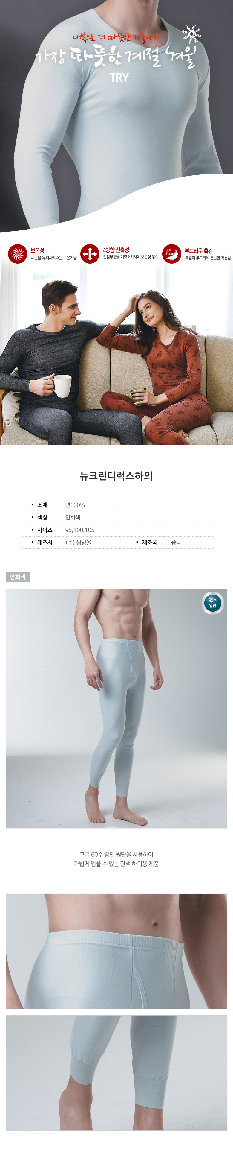 [트라이]뉴크린디럭스 순면 남성 겨울동내의 하의-회색
