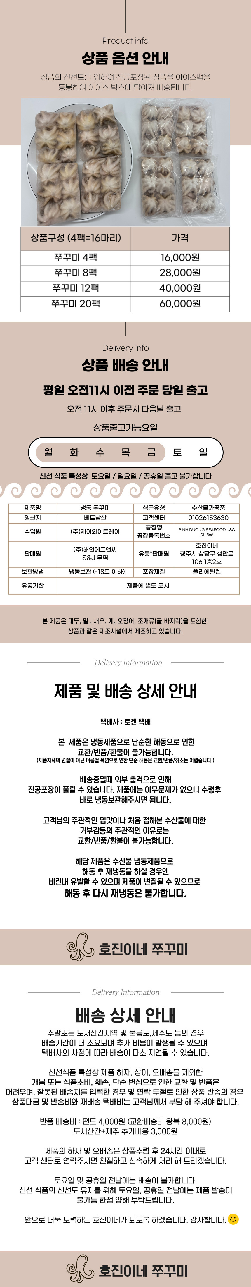 호진이네 100% 수작업 냉동손질오징어 원양산 호진이네 급냉오징어 2마리~10마리