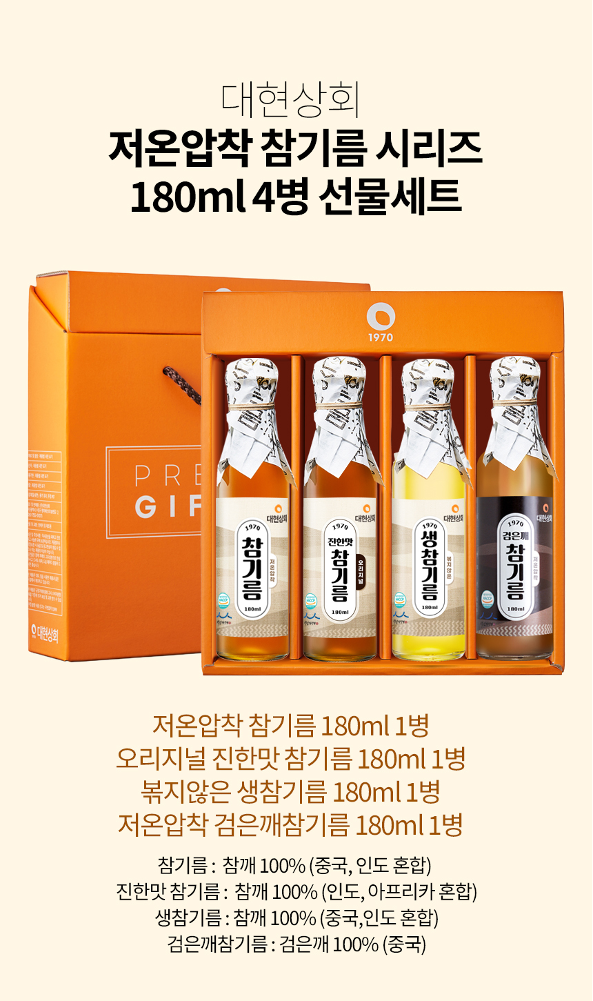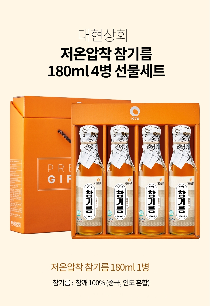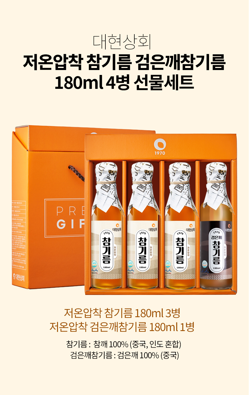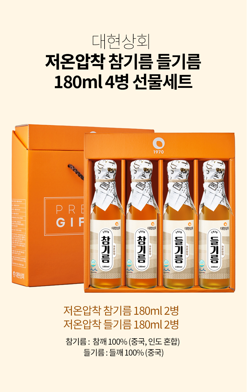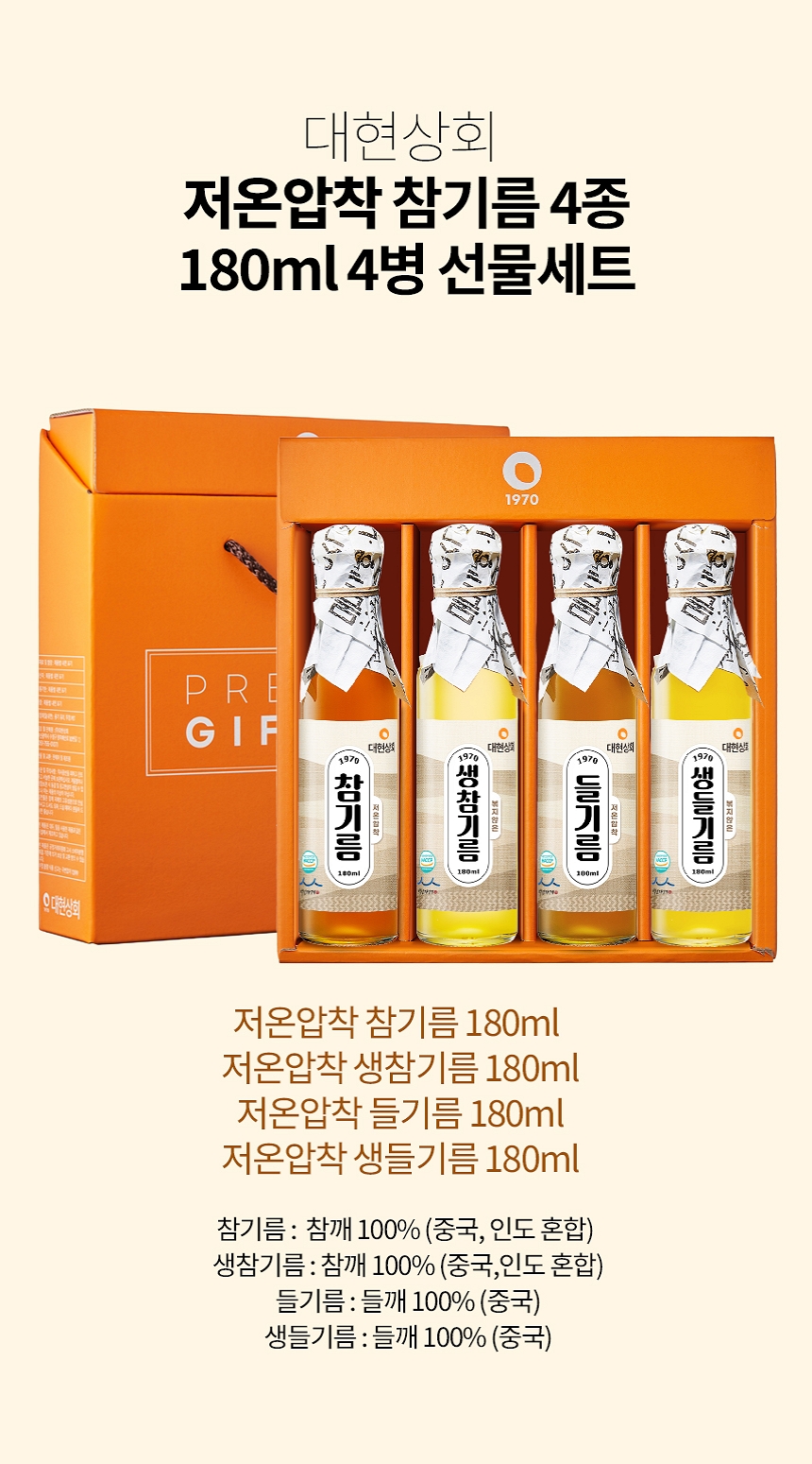 55년전통 대현상회 저온압착 참기름 들기름 180ml x4병 선물세트/ HACCP 인증 백년가게