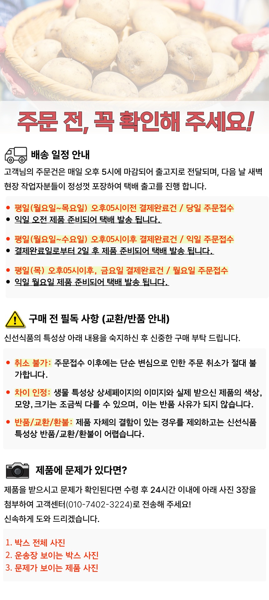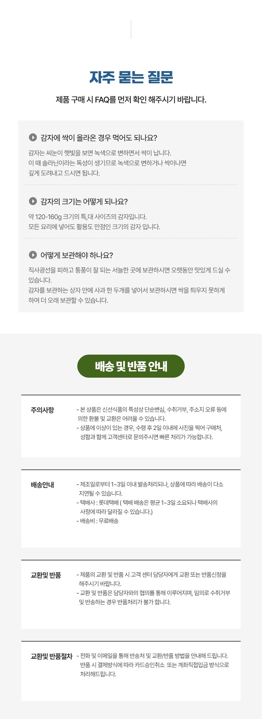 - 상품 수령 후 7일 이내에 신청하실 수 있습니다. 단, 제품이 표시·광고 내용과 다르거나, 계약과 다르게 이행된 경우는 제품 수령일부터 3개월 이내, 그 사실을 안 날 또는 알 수 있었던 날부터 30일 이내에 교환/반품이 가능합니다.