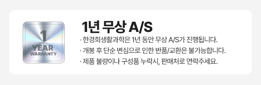 - 상품 수령 후 7일 이내에 신청하실 수 있습니다. 단, 제품이 표시·광고 내용과 다르거나, 계약과 다르게 이행된 경우는 제품 수령일부터 3개월 이내, 그 사실을 안 날 또는 알 수 있었던 날부터 30일 이내에 교환/반품이 가능합니다.