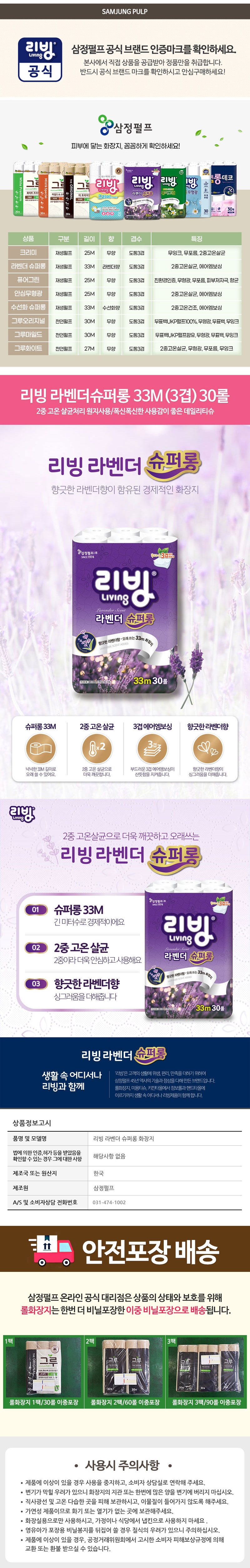 삼정펄프 리빙 라벤더 슈퍼롱 33M 화장지 30롤x2