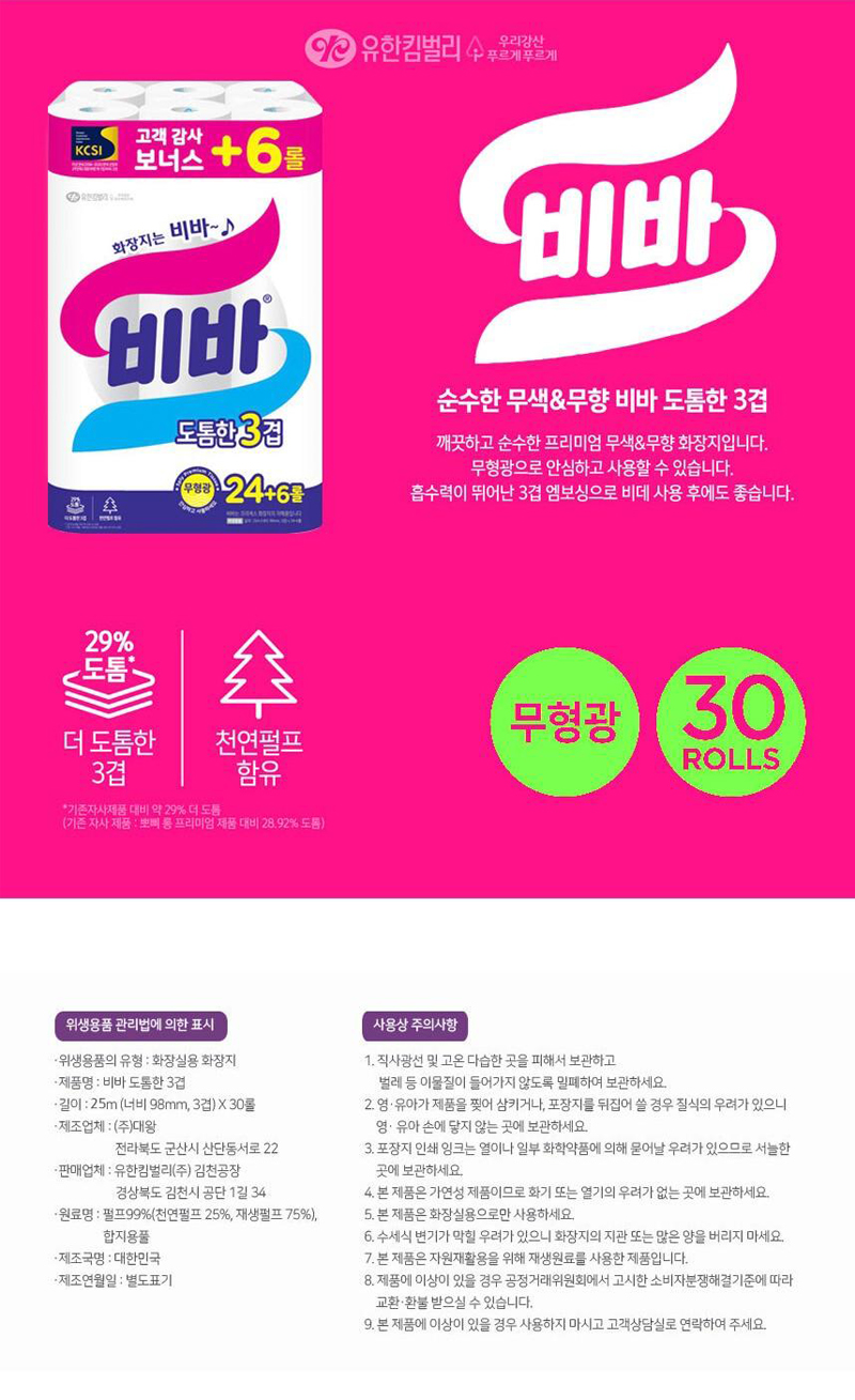 [유한킴벌리] 비바 도톰한 롤화장지 대용량휴지 24+6롤