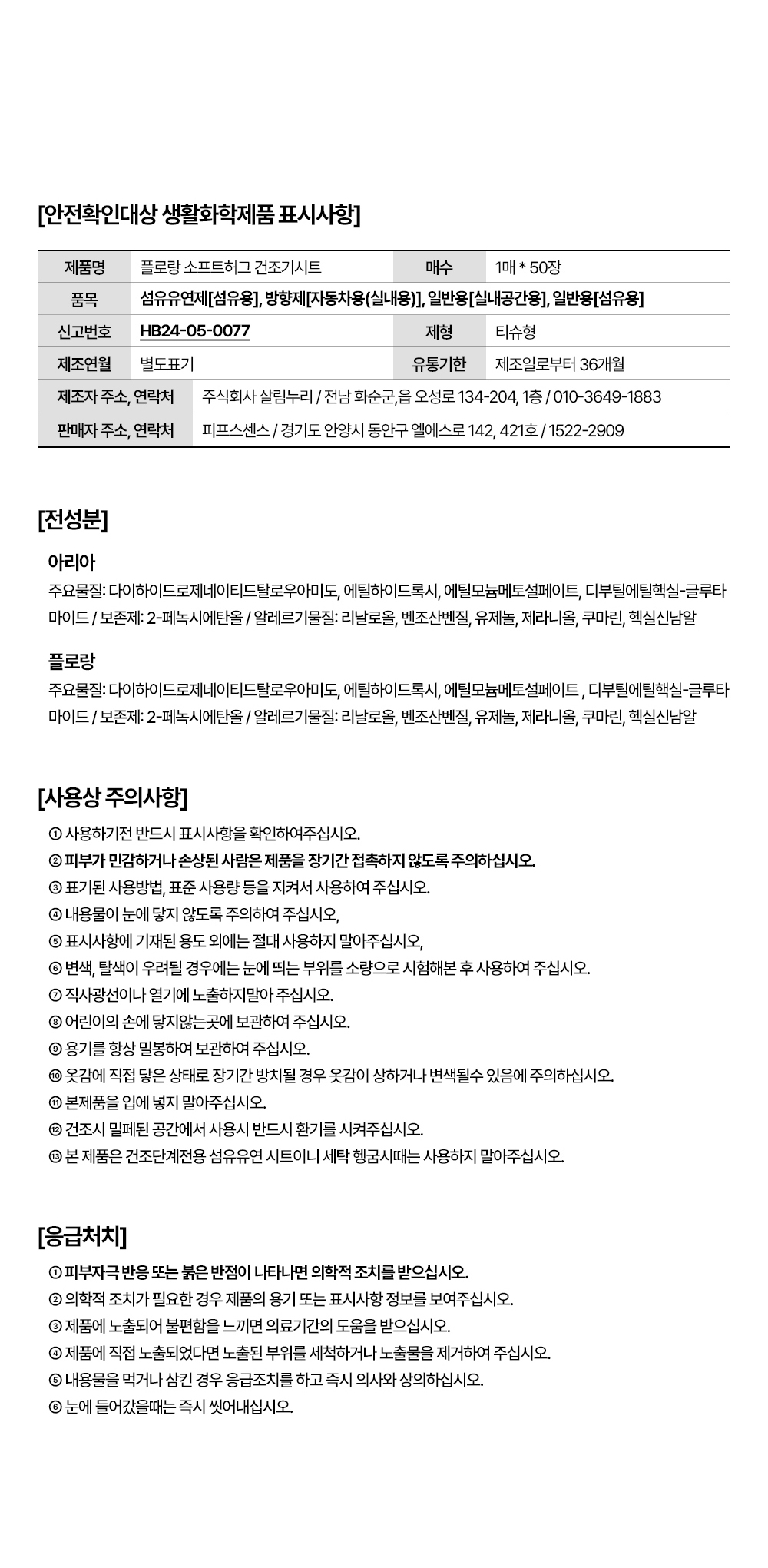 플로랑 소프트허그 건조기시트 드라이시트 50매