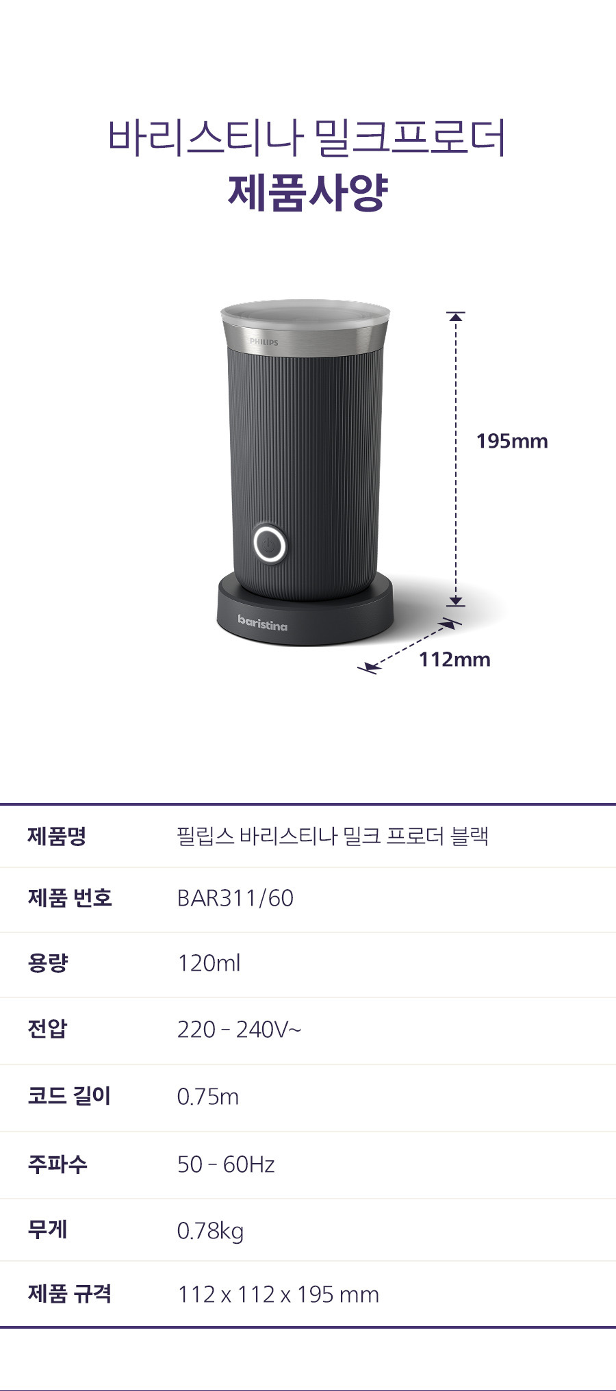 [필립스] 바리스티나 밀크프로더 블랙 BAR311/60