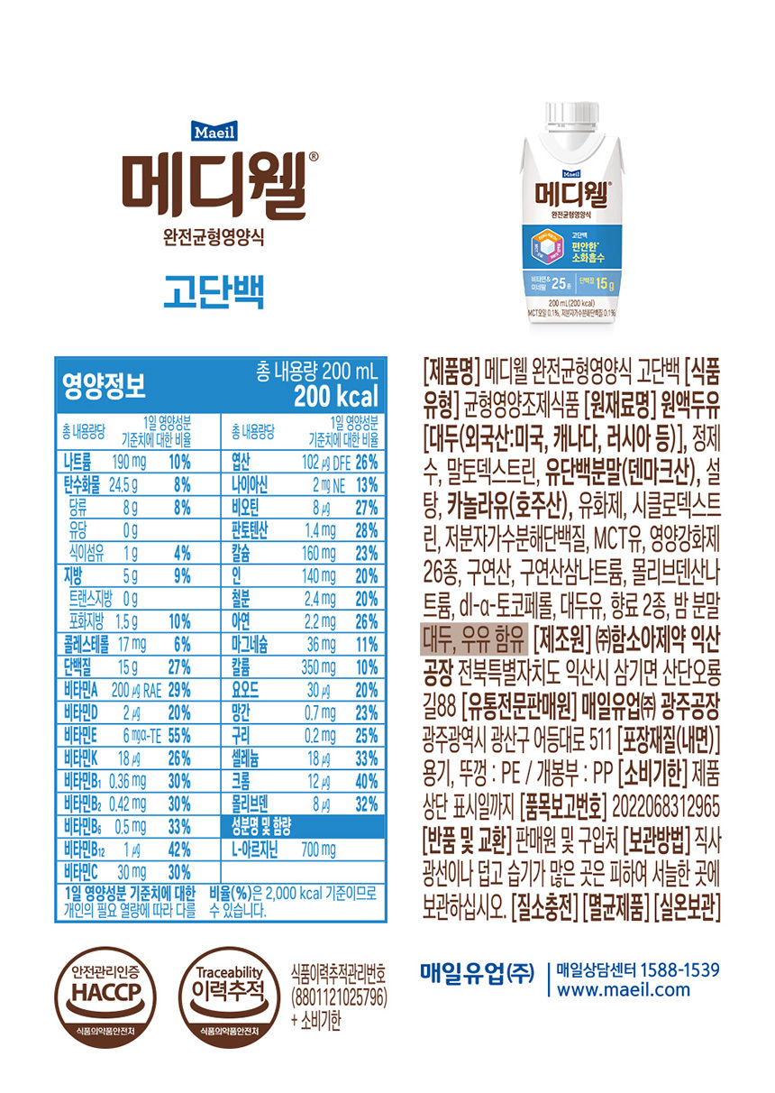 메디웰 완전균형영양식 고단백 200ml 36팩(18입 2박스)