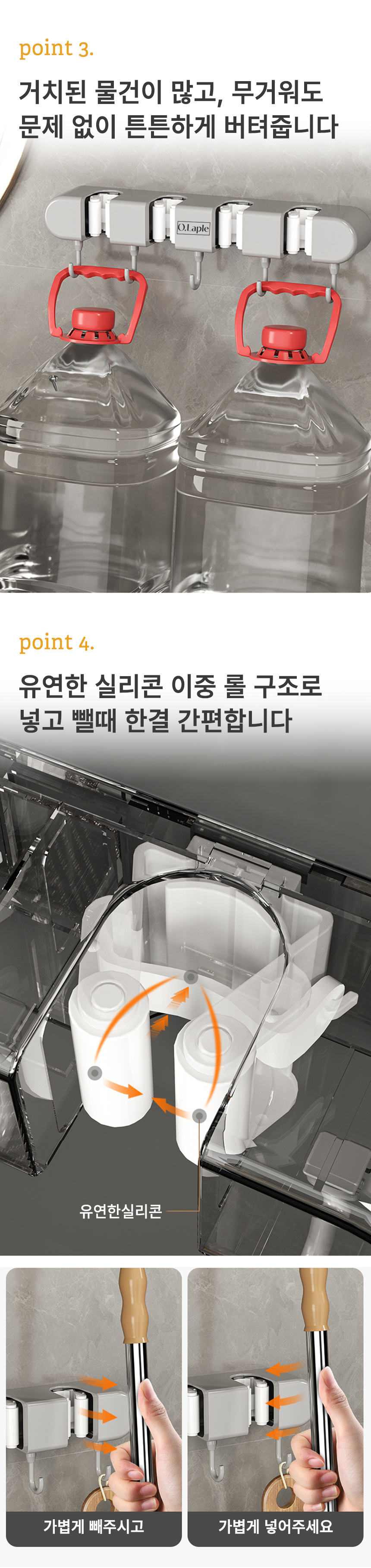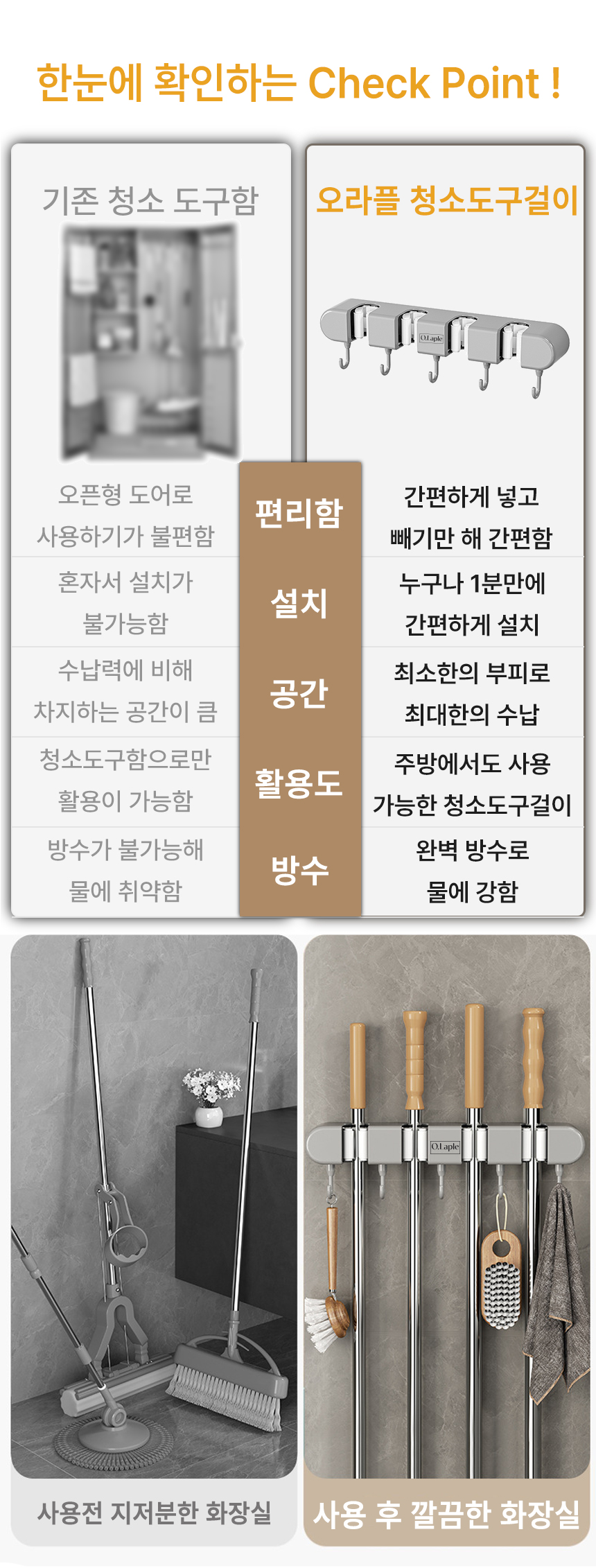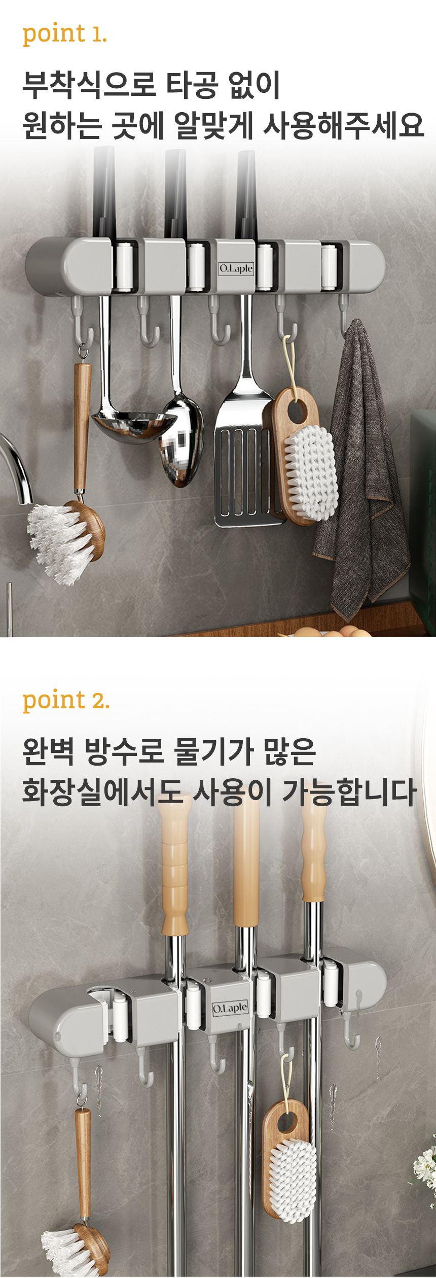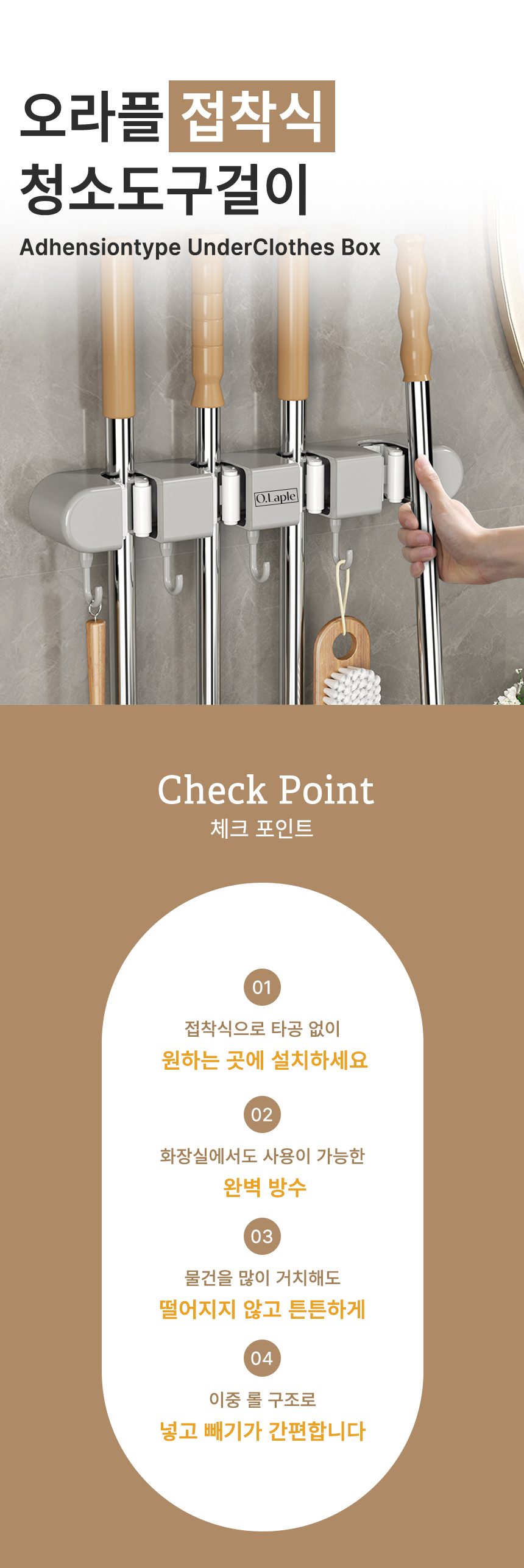 [오라플] 무타공 접착식 청소도구걸이 다용도 밀대걸이 4구 (색상/택1)