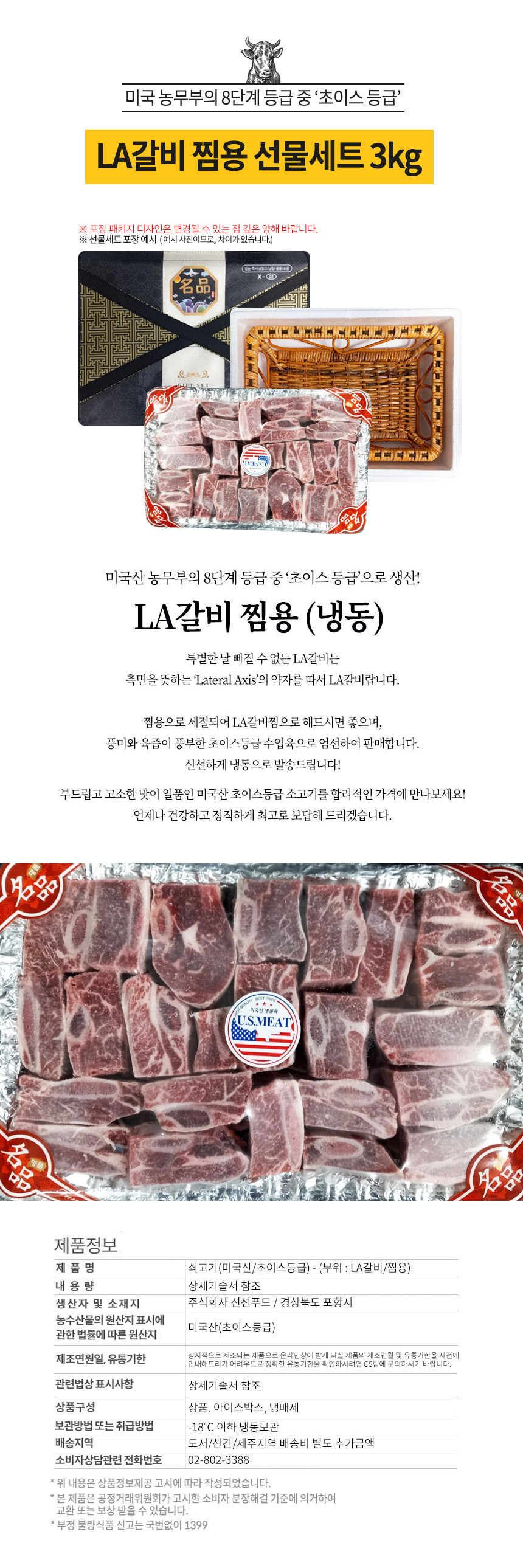 신선한 미국산 초이스등급 LA갈비 찜용 3kg 선물세트
